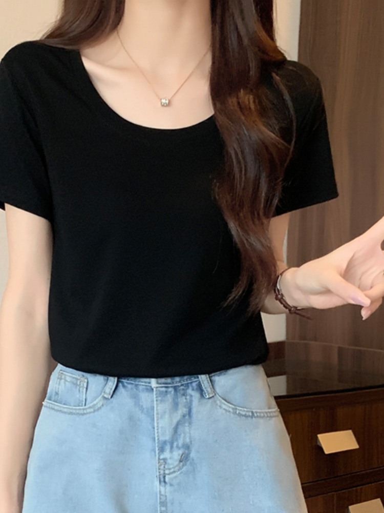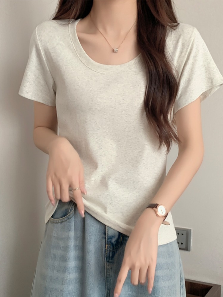 Classic basic U-collar Gray all-match short-sleeved T-shirt Women's American-style slim-fit slimming half-sleeve top low collar bottoming shirt