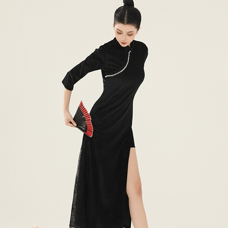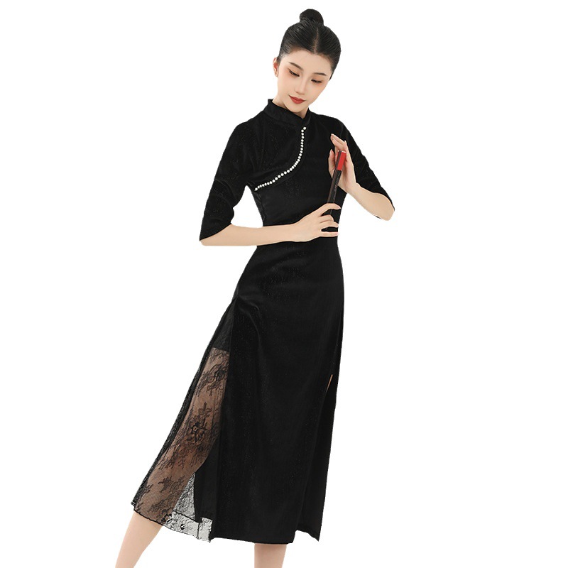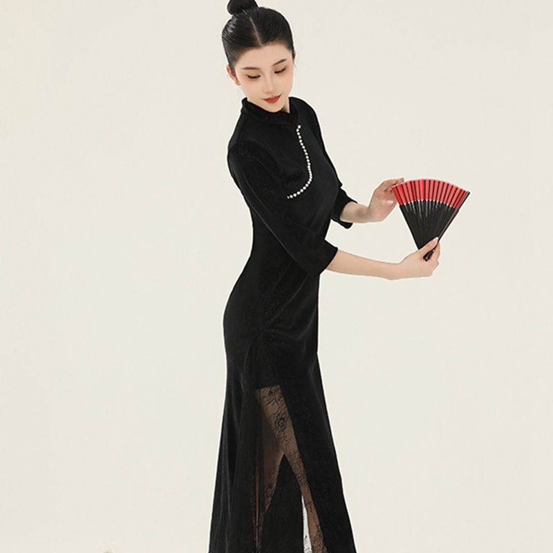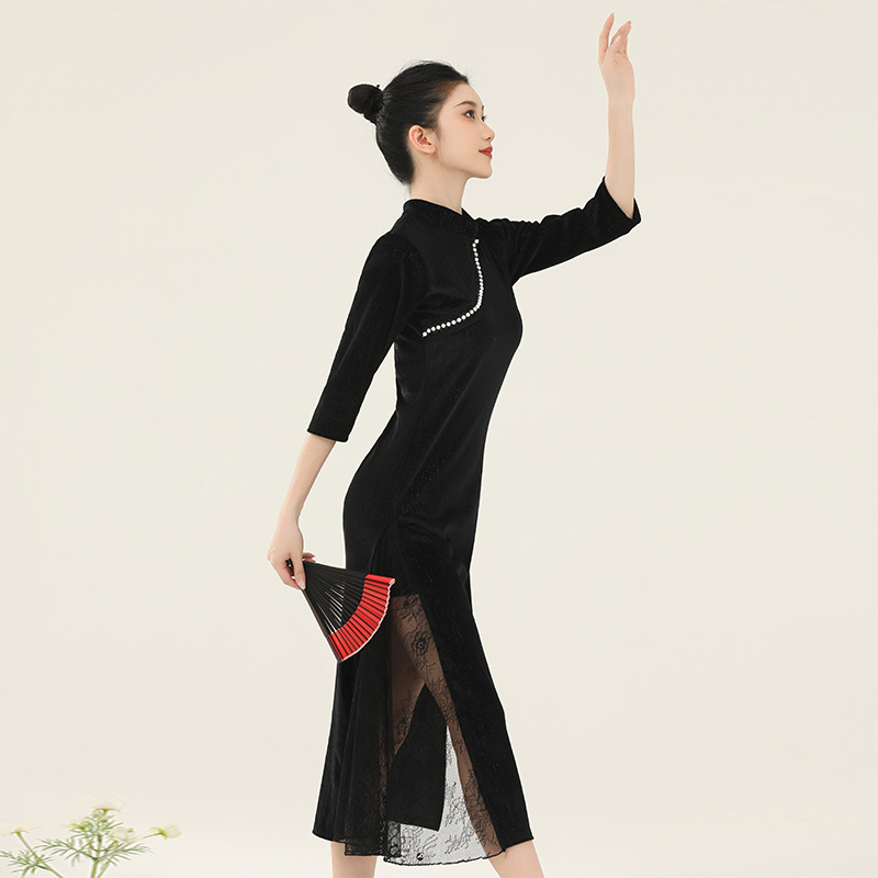 | nameOriginal | Classical Dance Skirt Cheongsam Temperament Ethnic Style Dance Black Velvet Pearl High Split Lace Chongsam Skirt |