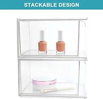 Clear acrylic storage drawers for makeup and bathroom essentials, stackable and versatile for use in kitchen cabinets, pantry, and home organization.