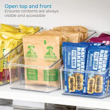 Clear plastic bin with handles for organizing kitchen, fridge, freezer, pantry, and cabinets. BPA-free and measures 10.5″ x 5″ x 5″.