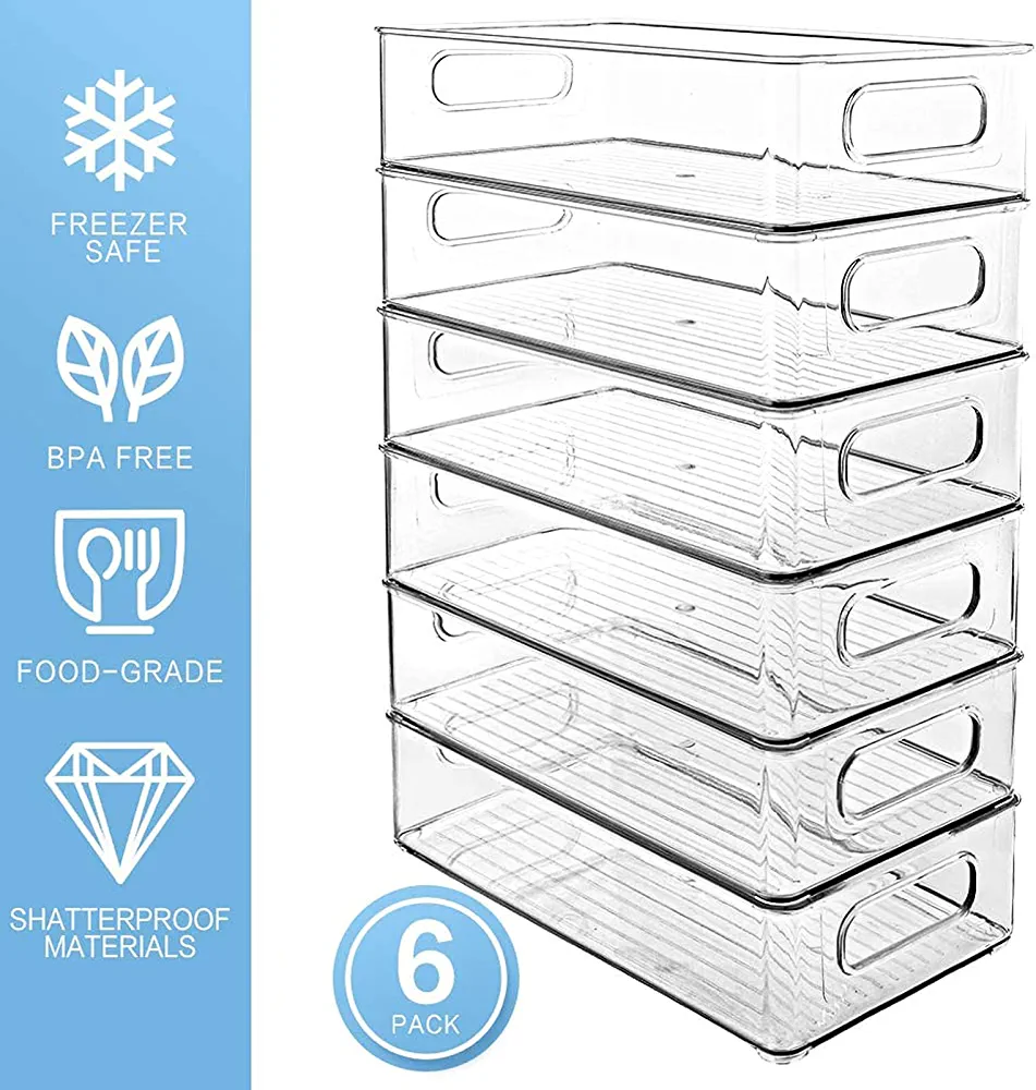 The U-HOOME storage organizer bins are a practical addition to your household, perfect for food storage. They allow you to group and dispense similar items, making it easy to take out what you need. These bins are ideal for organizing fruits, vegetables, yogurts, canned goods, food packets, and cheese. They can be used in various locations such as kitchens, countertops, pantry shelves, refrigerators, freezers, cabinets, or as drawer organizers. The set includes 6 clear plastic bins that are stackable and convenient to use side by side. Each bin measures approximately 10” L × 6” W × 3” H, making them a good size to fit all kinds of storage spaces.