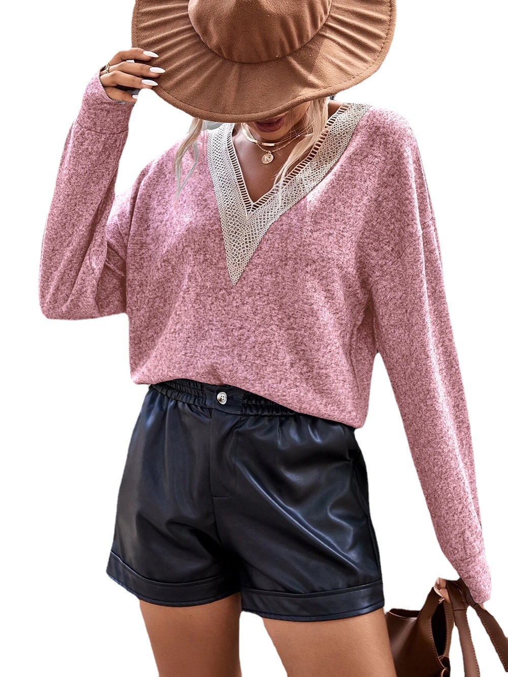 | nameOriginal | Clearance of a cross-border Amazon autumn women's lace V-neck knitted casual solid color loose long sleeve T-shirt |