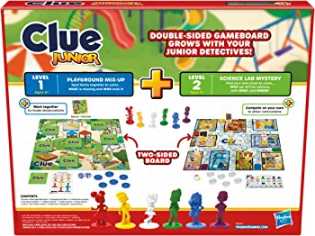 | nameOriginal | Clue Junior Game, 2-Sided Gameboard, 2 Games in 1, Clue Mystery Game for Younger Kids Ages 4 and Up, Kids Games for 2 to 6 Players, Junior Games |