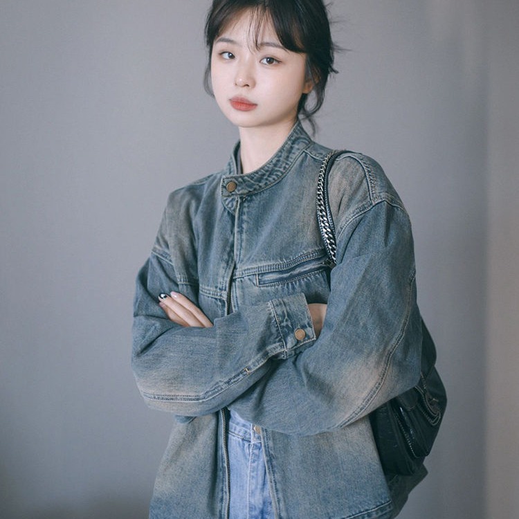 | nameOriginal | Coat# Hong Kong-style design standing collar loose Denim coat 2023 new vintage washed old jacket top |