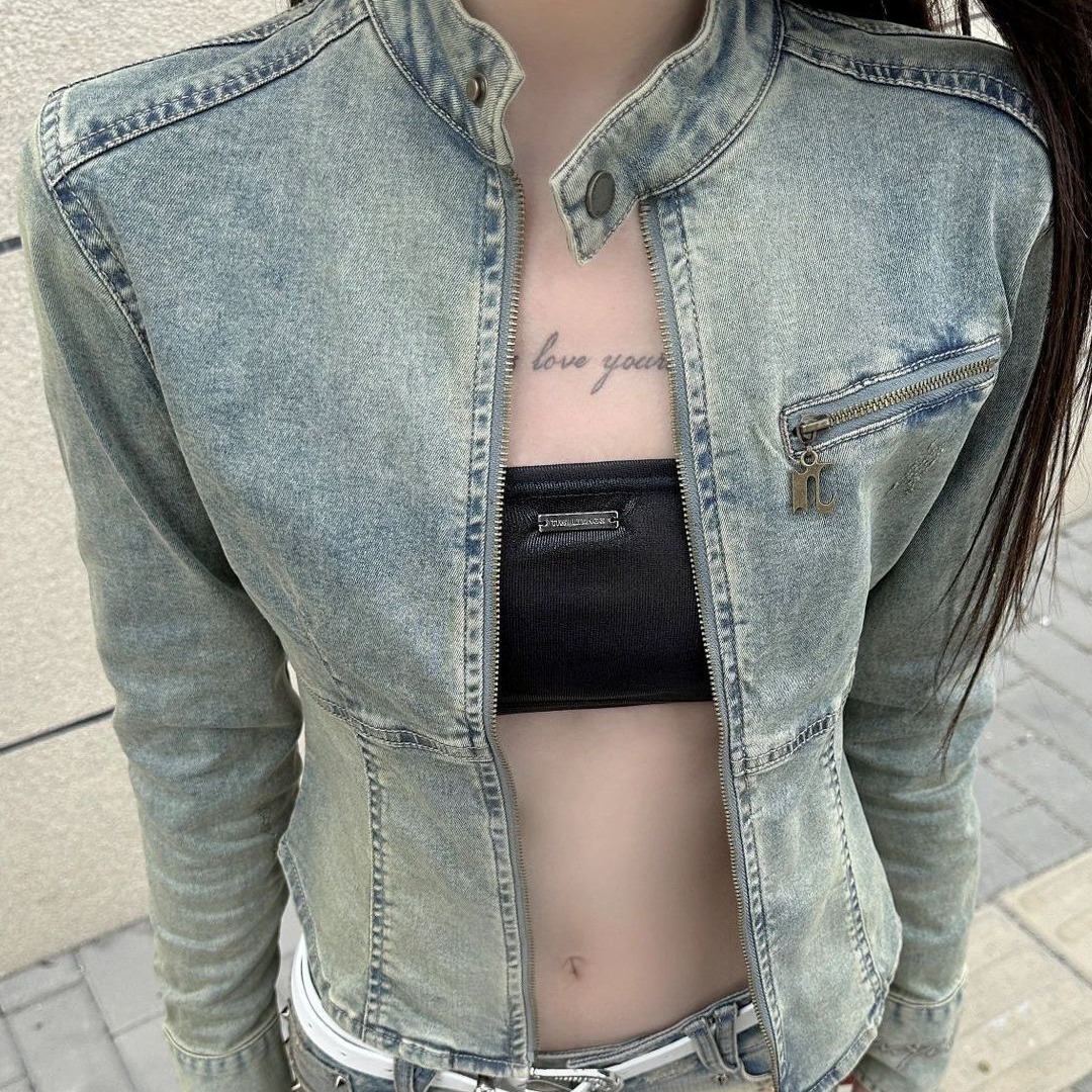 | nameOriginal | Coat# New American Spice Girl Retro Old Shirt Tight Waist Design Sexy Elegant Zipper Denim Coat |