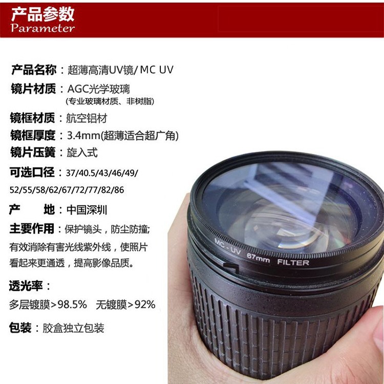 | nameOriginal | Coated MC UV mirror 67mm77mm25558623728286105 micro single camera SLR photography filter protection |