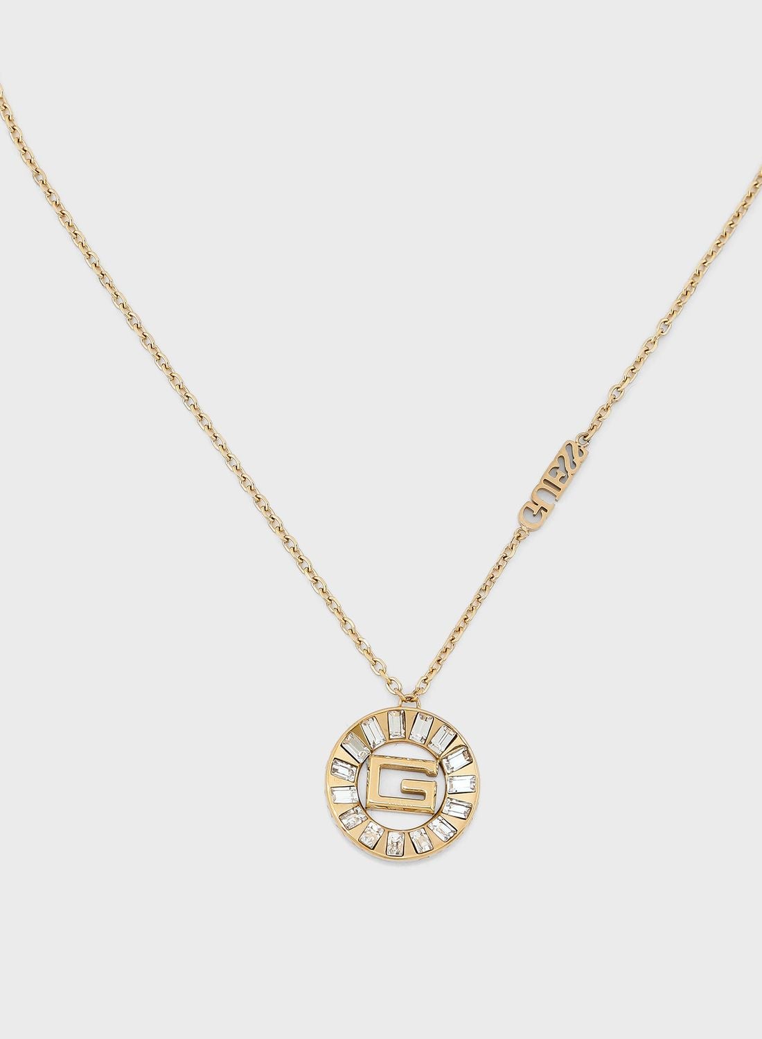 Coin necklace with a baguette pendant.