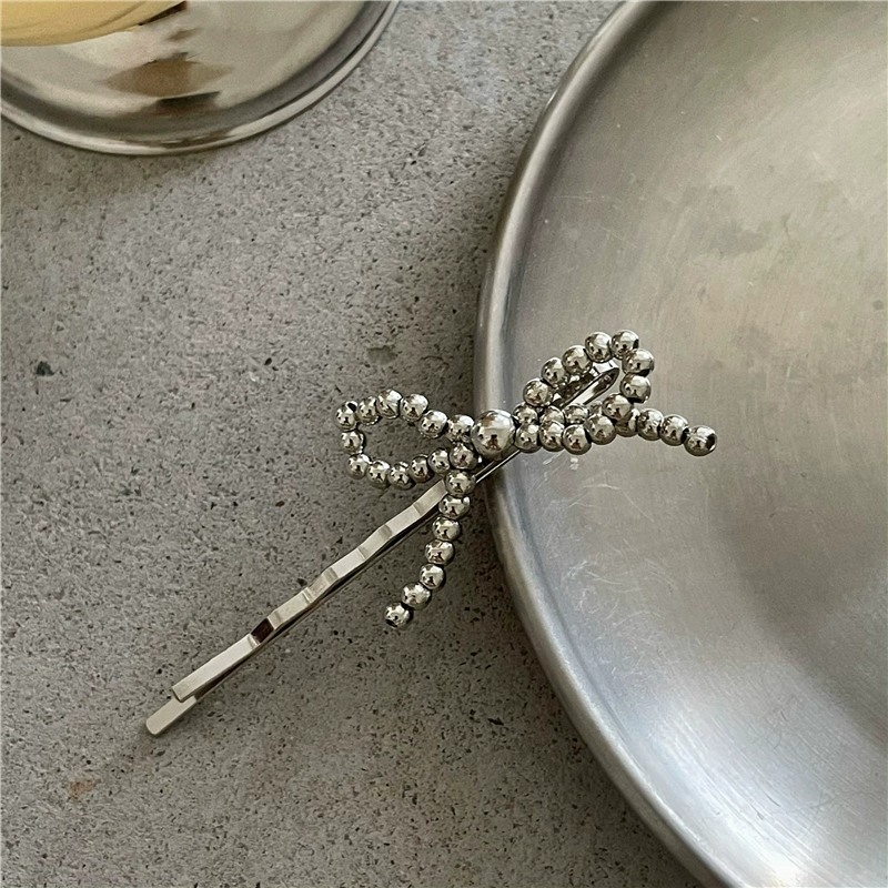 | nameOriginal | Cold style, metallic silver texture, round bead bow, bangs clip, duckbill clip, fashionable alloy hairpin side clip |