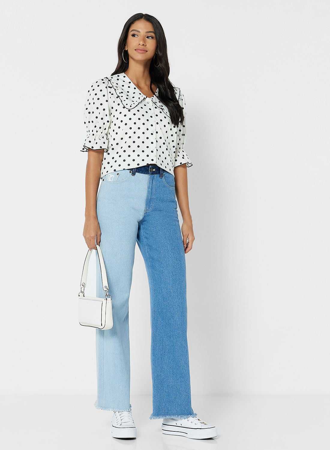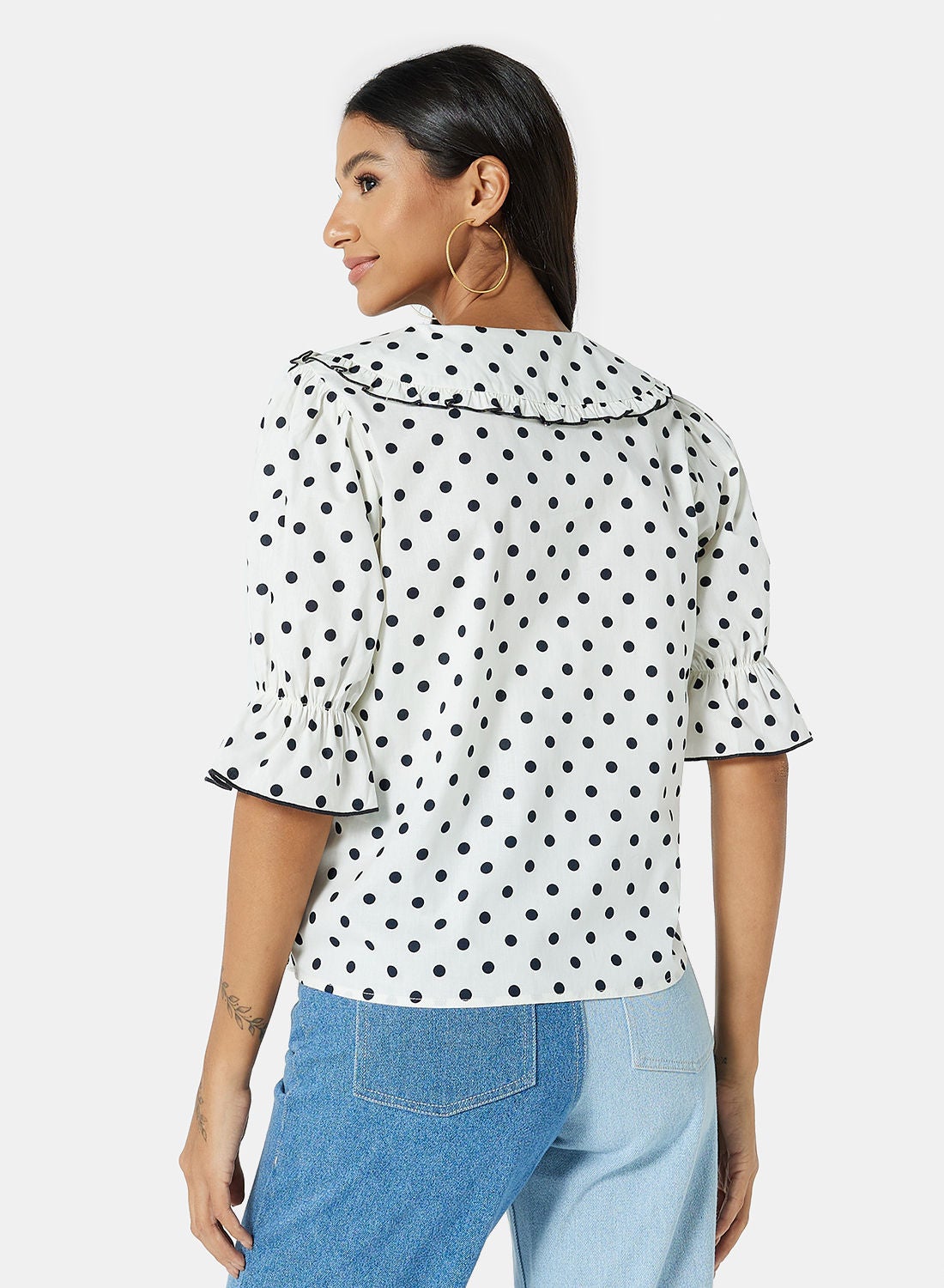 This product features a gentle and airy cotton material that is both soft and lightweight. The design showcases a striking contrast polka dot pattern throughout. It also includes a collared neckline with a front button closure, as well as short puffed sleeves with elastic cuffs. To ensure proper care, please refer to the label instructions when washing.