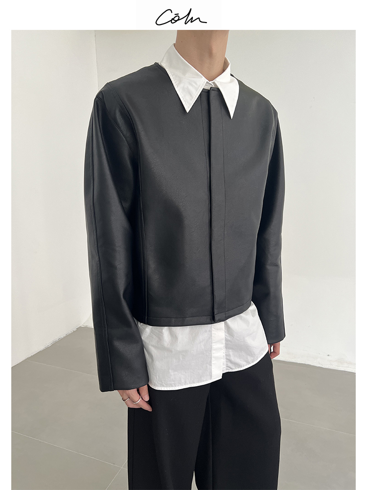 Collarless magnetic buckle short sense leather jacket