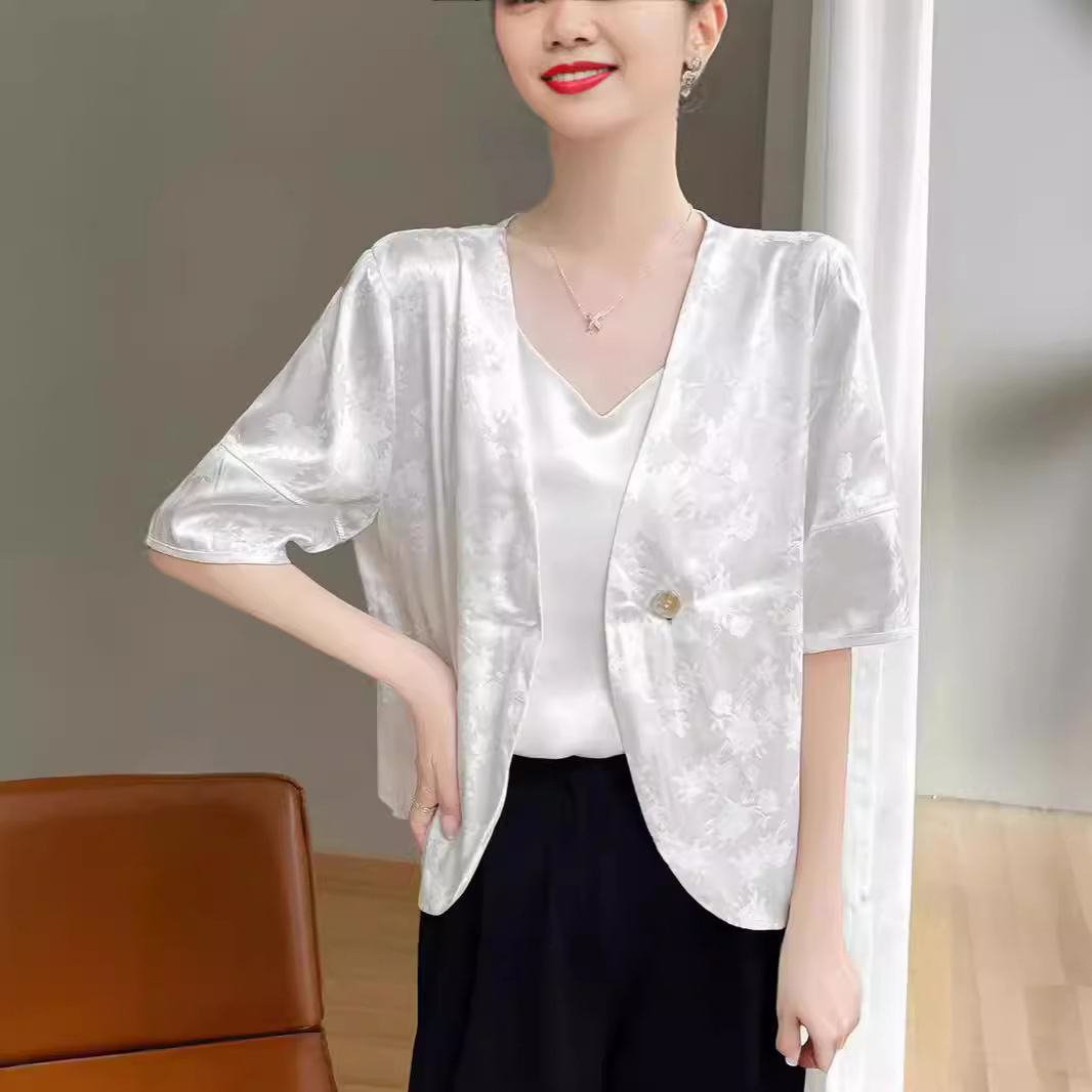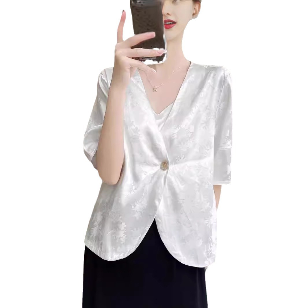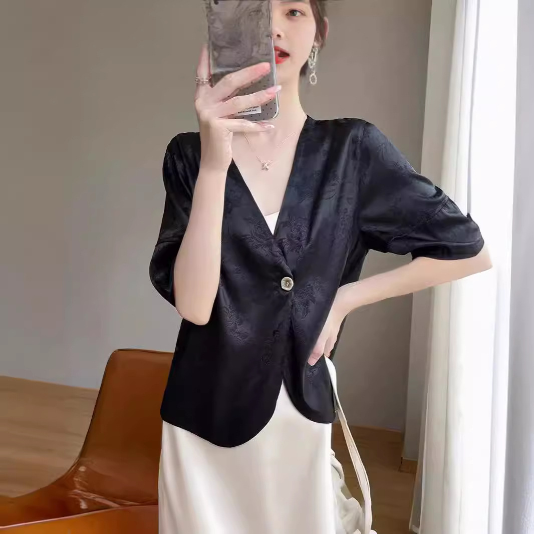 | nameOriginal | Collarless Suit Jacket Women's New Chinese Acetic Acid Satin Short Sleeve One Button Jacquard Lantern Sleeve National Fashion Small Suit |