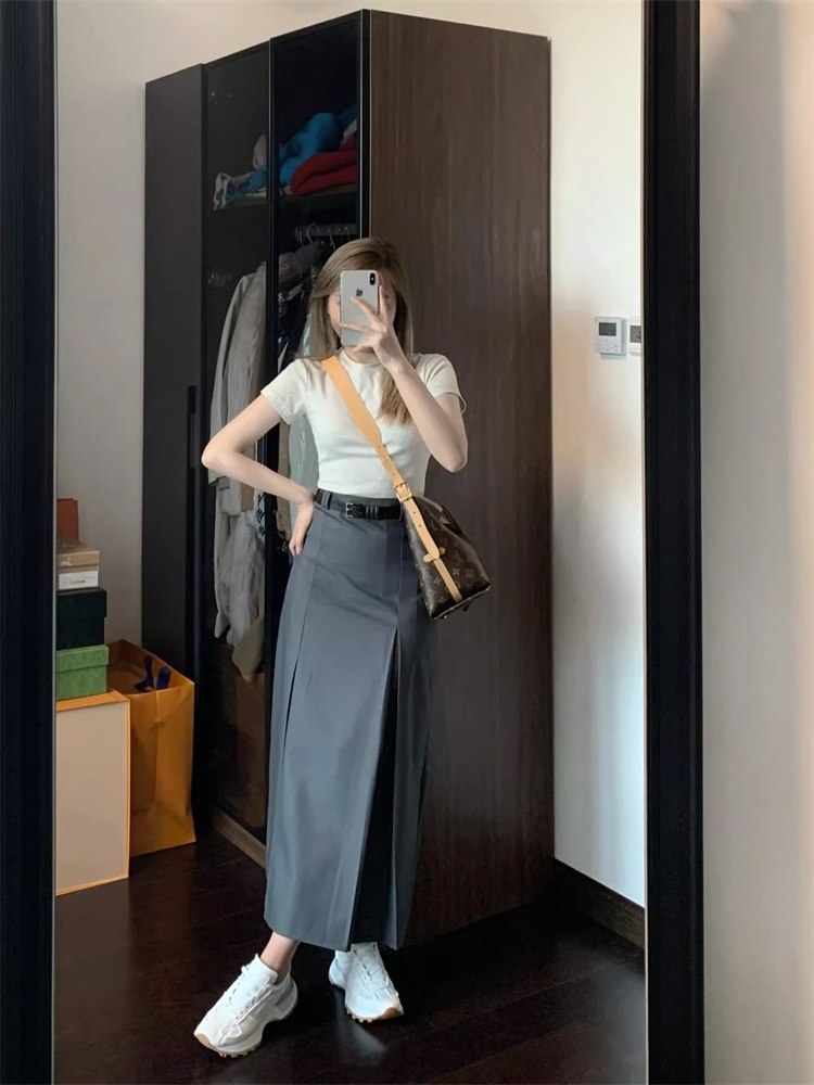 | nameOriginal | College style gray fat mm belly-covering draping suit skirt |