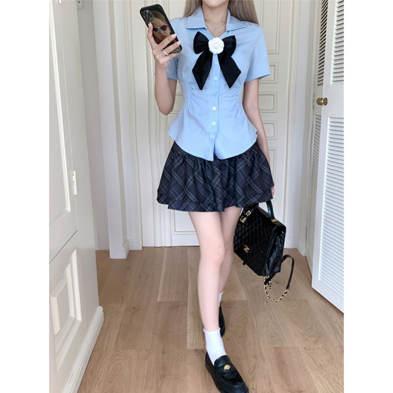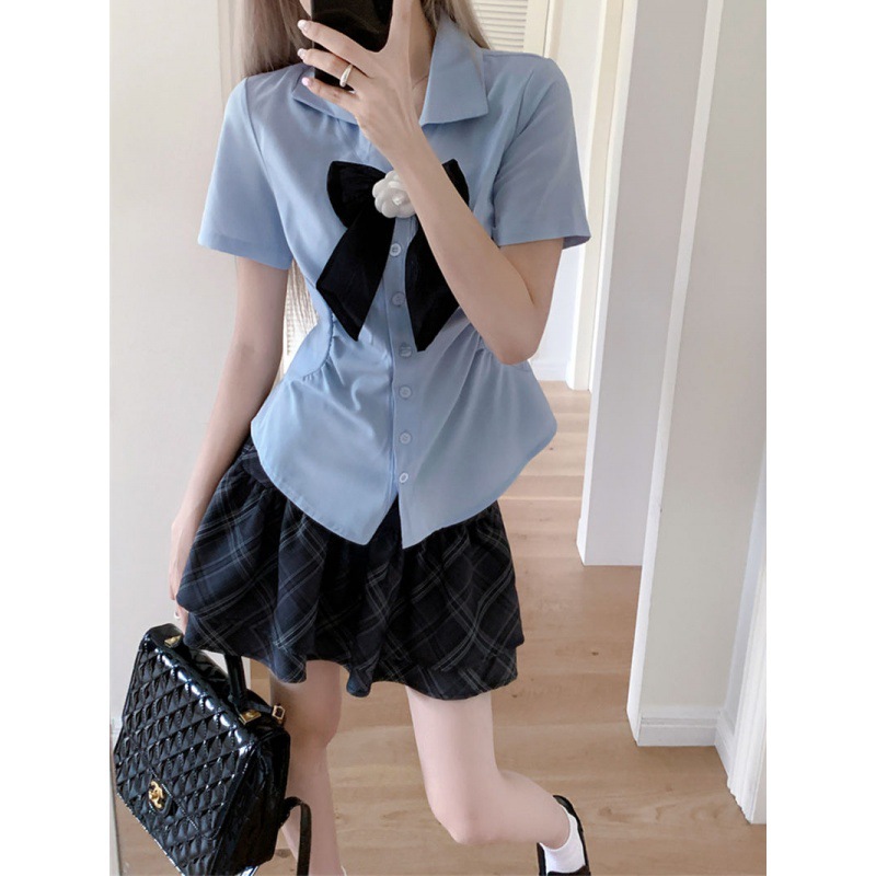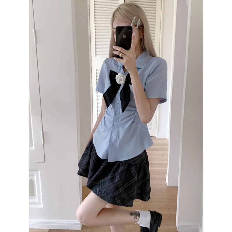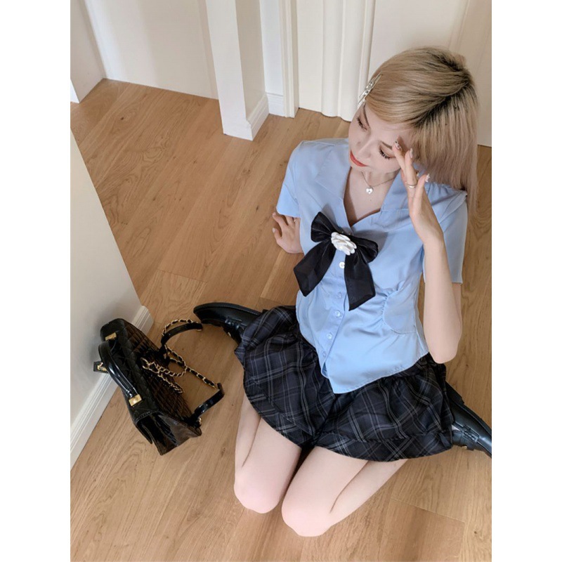 | nameOriginal | College Style JK Set Bow Short-sleeved Top Women's Summer Plaid Cake Short Skirt Two-piece Set |