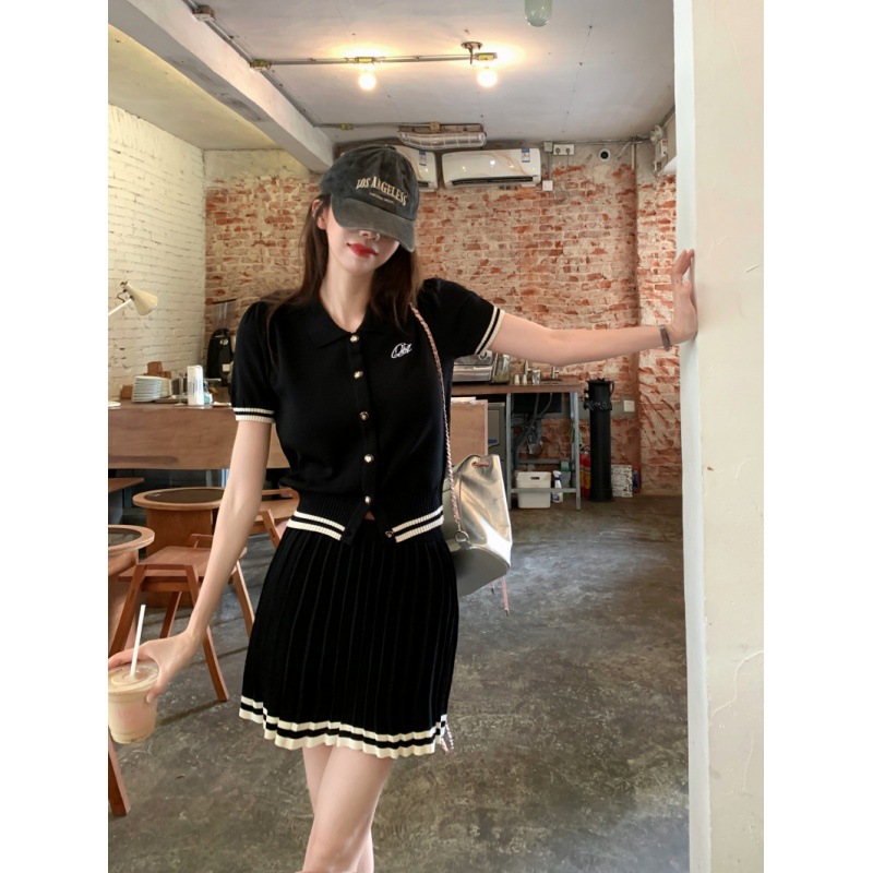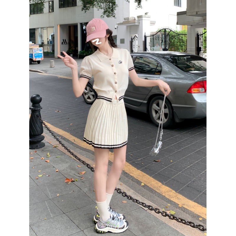 | nameOriginal | College Style Polo Casual Lapel Reduced Collar Knitted Pleated Skirt Set Two-Piece Set |