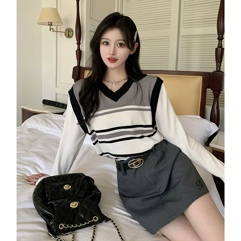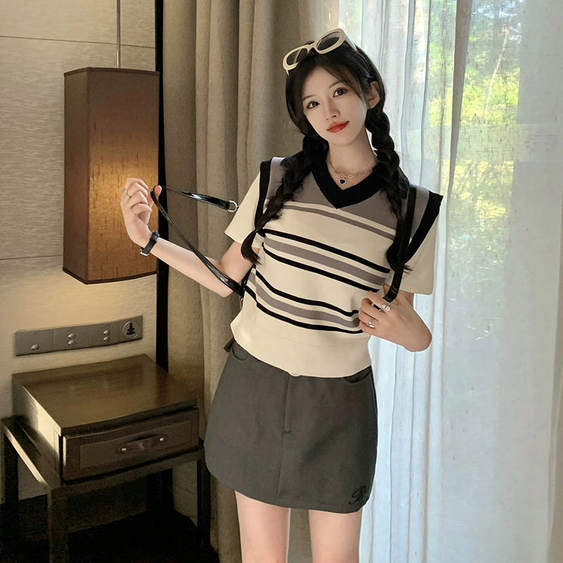 | nameOriginal | College style striped short-sleeved summer thin fake two-piece |