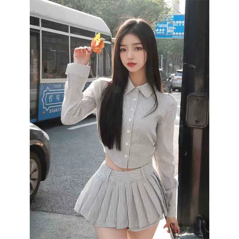 | nameOriginal | College style striped suit for women in spring and autumn, sexy hot girl, irregular short long-sleeved shirt, pleated pants and skirt two-piece set |