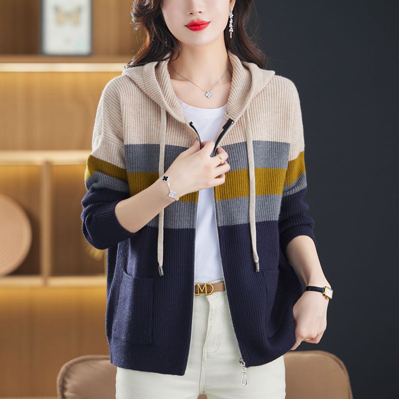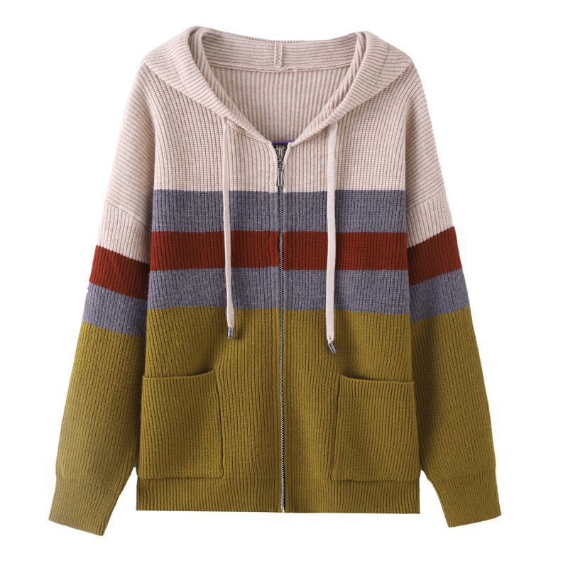 | nameOriginal | Color block hooded striped sweater coat women's 2024 autumn and winter new sweater casual pocket knitted cardigan women |