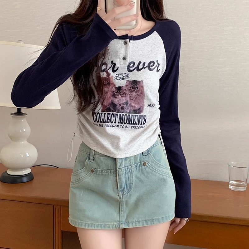 Color-matching Rag Long-sleeved T-shirt Women's Early Autumn Drawstring Tight Waist Slim-fit Half-open Collar Clavicle Cartoon Short Tops
