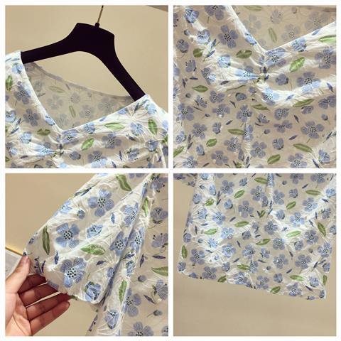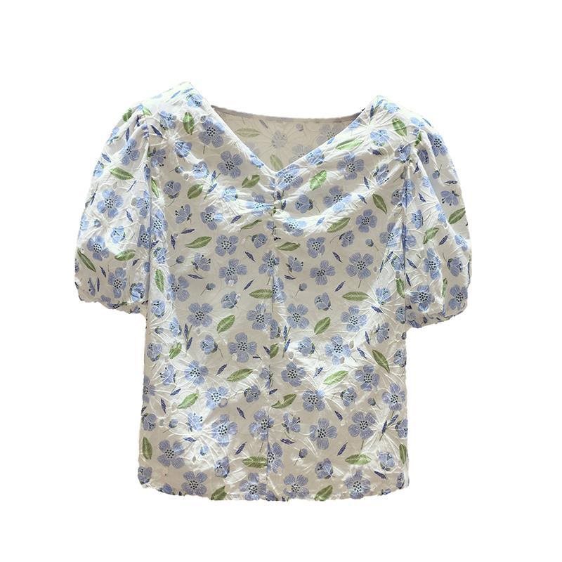 | nameOriginal | Color Pleated Short-sleeved Chiffon Shirt Women's 2021 Summer New Arrival Pretty Small Shirt Stylike Belly Covering Top V-Neck |
