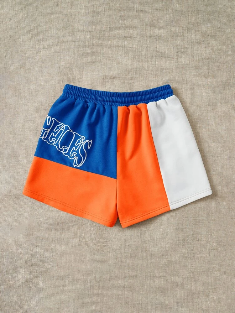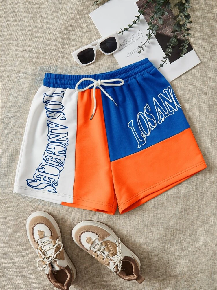 SHEIN EZwear Letter Graphic Colorblock Drawstring Waist Shorts