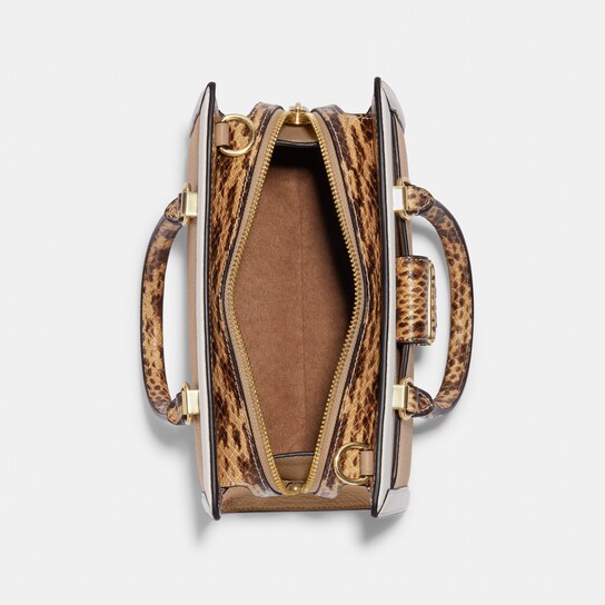 This product features a combination of high-quality pebble leather and snake-embossed leather, giving it a refined and sophisticated look. It includes a convenient multifunction pocket inside, as well as a zip closure and fabric lining for added durability. The handles have a 4″ drop, and there is an outside slip pocket with a magnetic closure for easy access to your belongings. Additionally, the detachable strap has a 21 3/4″ drop, allowing for versatile shoulder or crossbody wear. The bag also includes four protective feet at the base to keep it in pristine condition. Its dimensions are 9 1/4″ (L) x 7″ (H) x 4 1/2″ (W), and its style number is CD484.