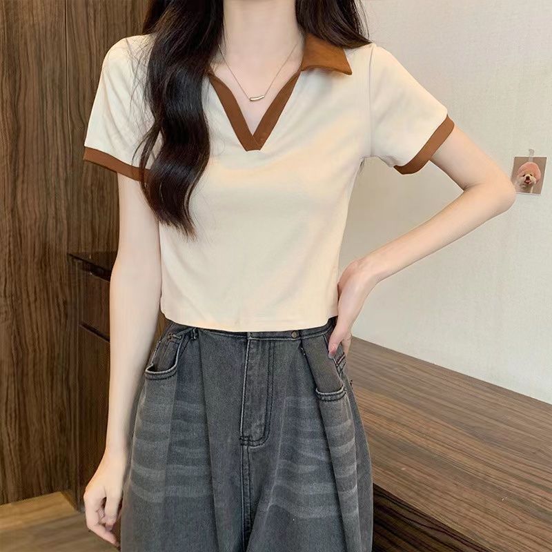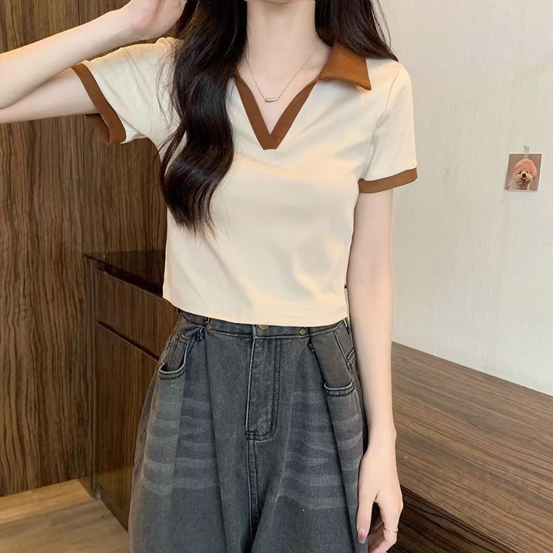 | nameOriginal | Colorblock Polo Collar Short-sleeved T-shirt Women's 2023 Summer New Slimming V-neck Niche Short Design Top |