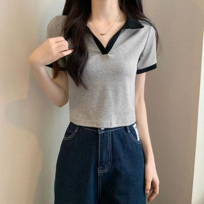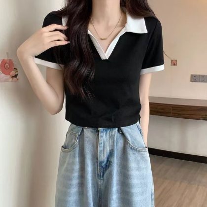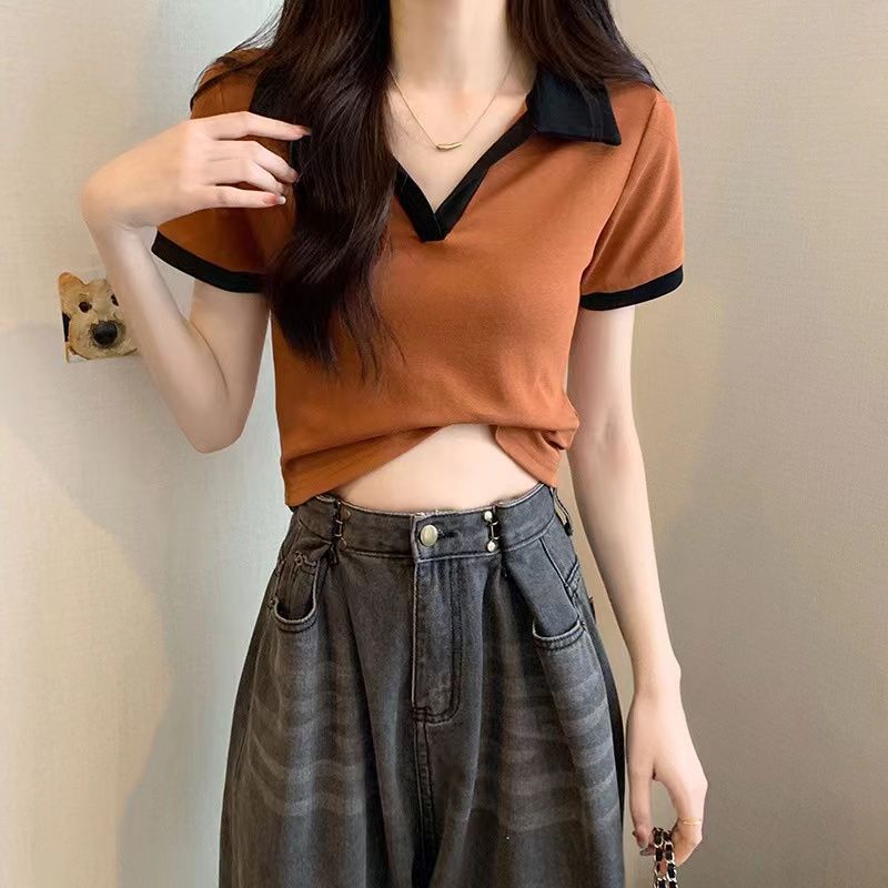 | nameOriginal | Colorblock Polo Collar Short-sleeved T-shirt Women's 2023 Summer New Slimming V-neck Niche Short Design Top |