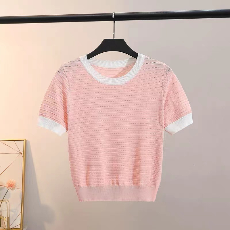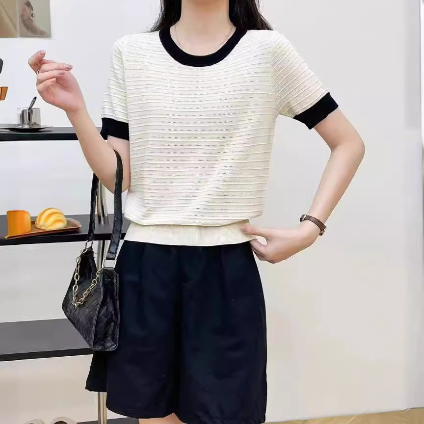 Colorblock Short-sleeved Ice Silk Knitted Shoulder Short-sleeved T-shirt Women’s Summer Slimming Design Niche Short Chic Top