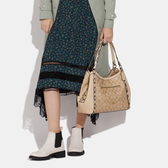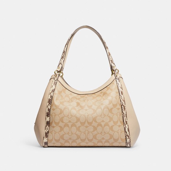 This product features a combination of signature coated canvas, refined leather, and snake-embossed leather. It includes various pockets such as an inside zip, cell phone, and multifunction pockets, as well as a center zip compartment. The product is secured with a snap closure and has a fabric lining. It also includes handles with a 9 1/2″ drop and an outside zip pocket. The dimensions of the product are 12 1/2″ (L) x 10 3/4″ (H) x 5 3/4″ (W) and its style number is C7332.