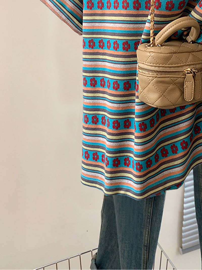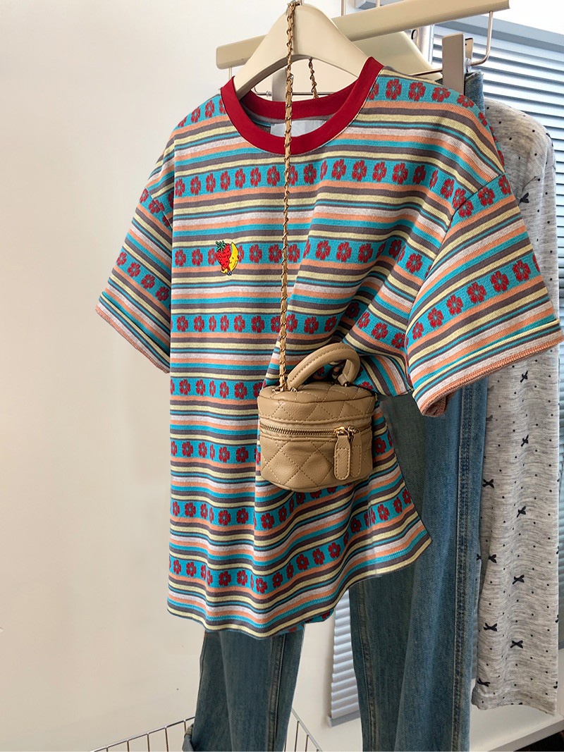 | nameOriginal | Colorful Striped Floral Short-sleeved T-shirt Women's Summer 2024 New Dopamine plus size chubby girl Loose Half-sleeved Top Trendy |