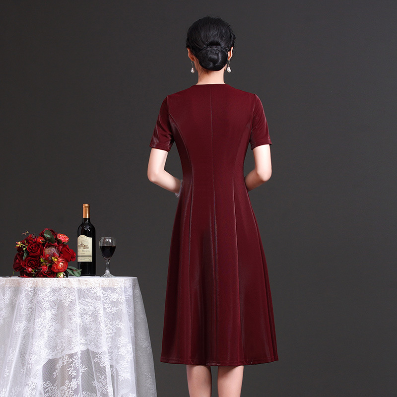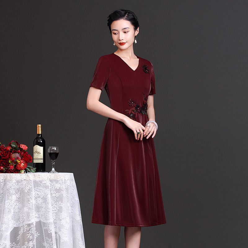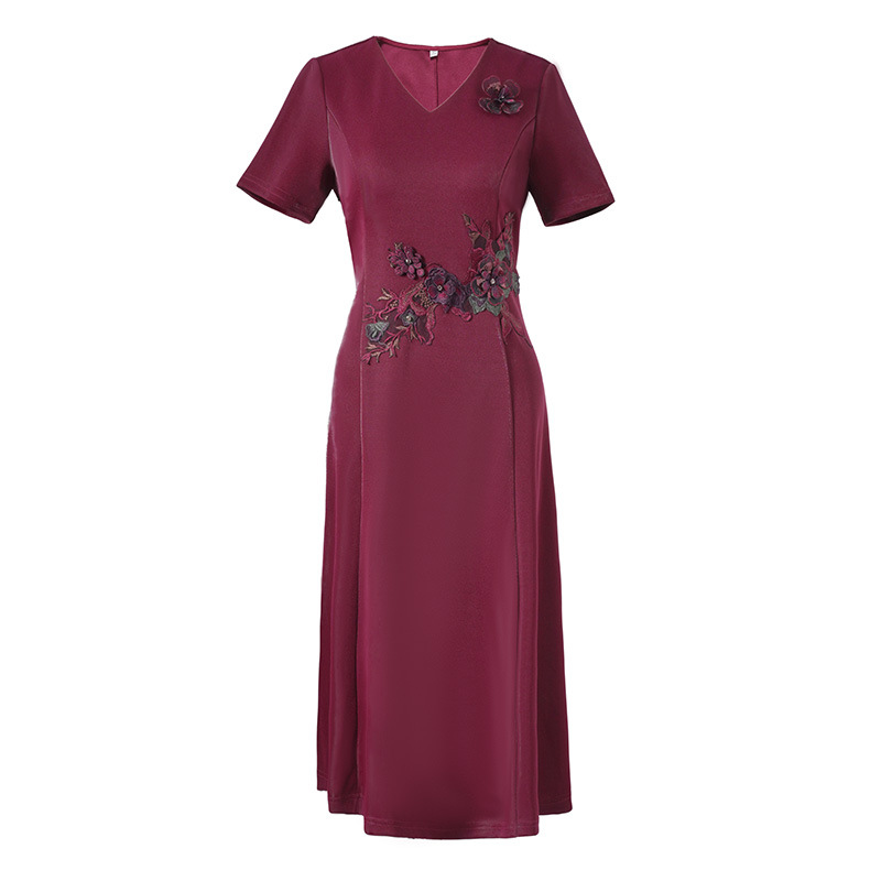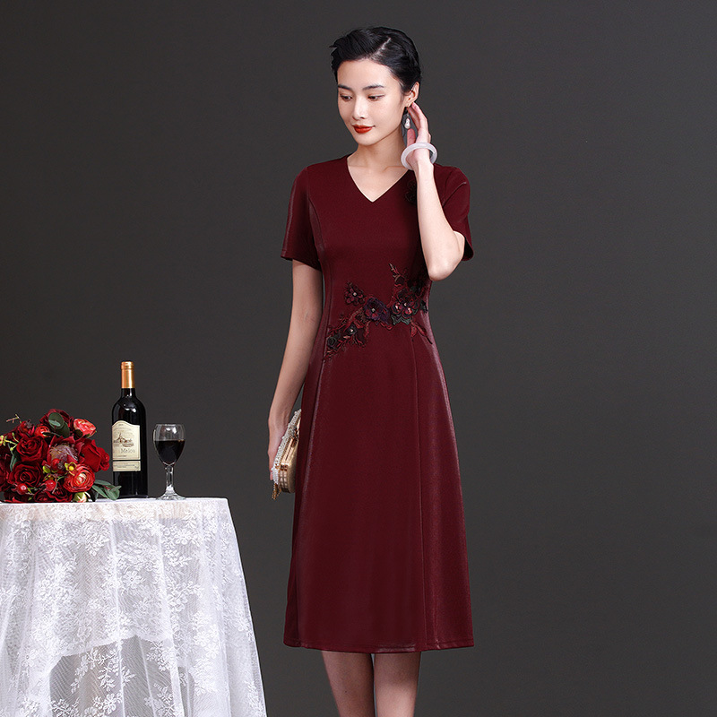 | nameOriginal | Comfortable and fashionable pearl silk embroidered V-neck dress waist slimming wedding banquet mom wear middle-aged and elderly women's clothing |