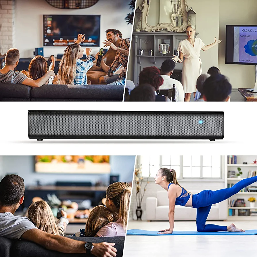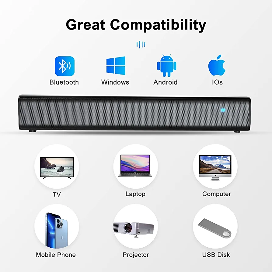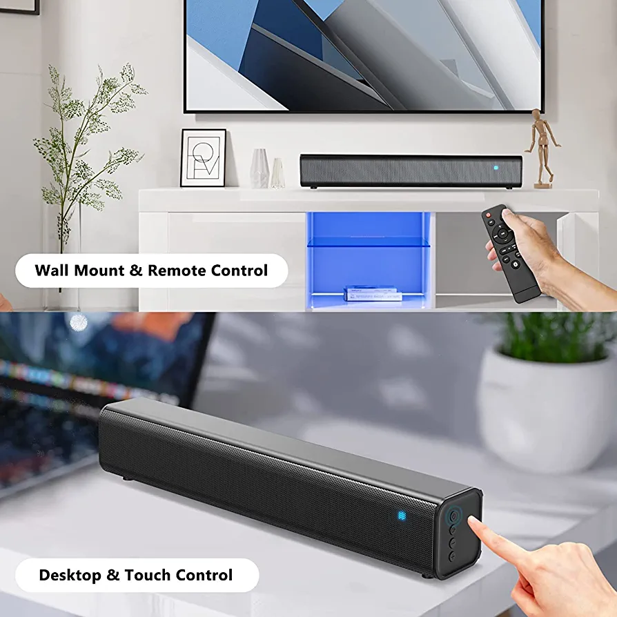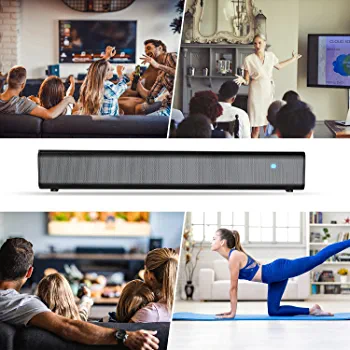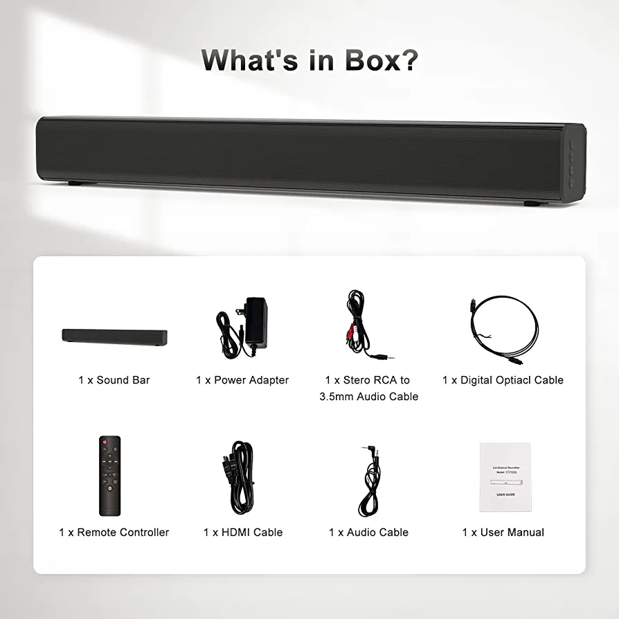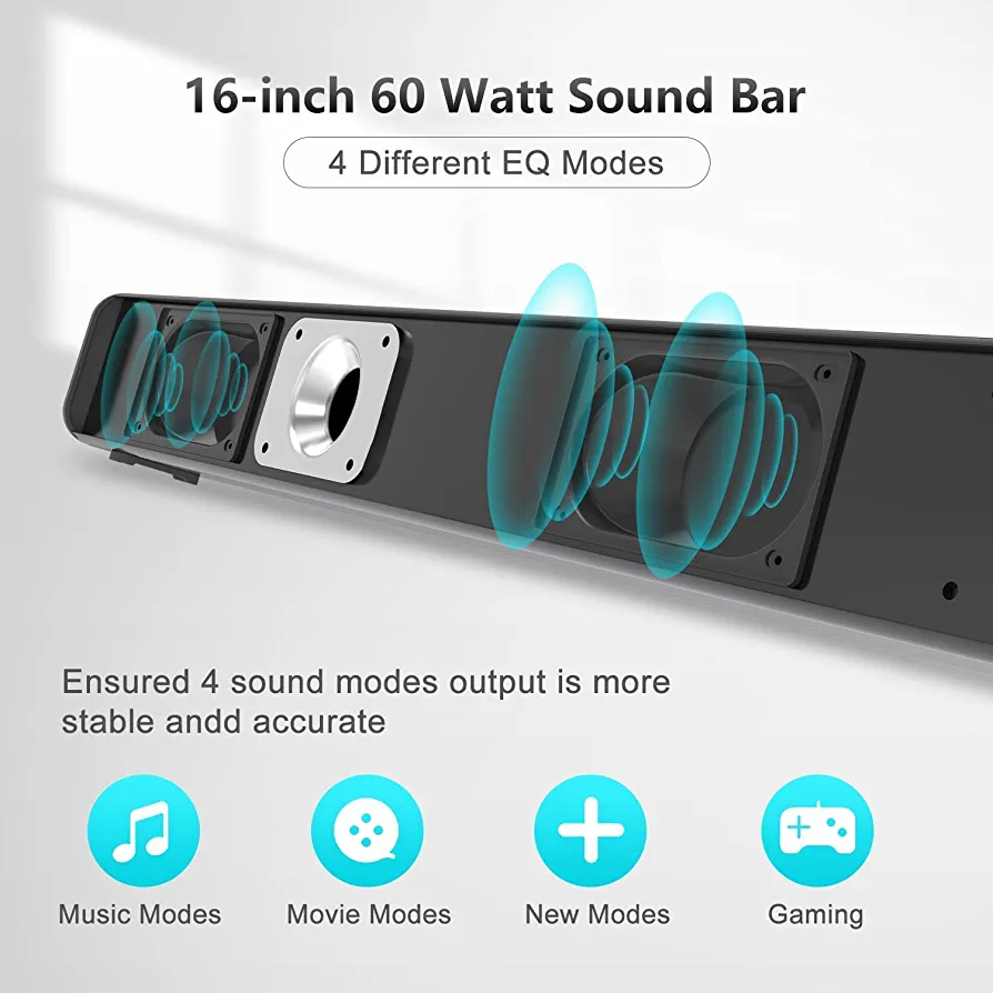 Experience big sound from a small soundbar with the built-in 60-watt output power. You won’t have to turn up your TV to hear clear treble anymore. The soundbar is equipped with DSP technology and advanced full-range, high-sensitivity tweeter drivers for accurate sound field positioning and clear vocals. You can fine-tune your sound with 4 EQ modes (Music, News, Movie, Game) via the remote control. The soundbar supports Bluetooth 5.0 for fast and stable wireless connections with smartphones and other devices. You can also connect via AUX/RCA, optical fiber, USB, and other wired methods. The compact and stylish design adds a modern touch to your home, and it can be placed next to your TV or mounted on a wall. The package includes the soundbar, remote, cables, and user manual. If you encounter any issues, please contact us via Amazon for prompt assistance.