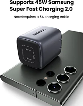 | nameOriginal | UGREEN 45W USB C Charger, Nexode GaN Dual USB C Foldable Wall Charger Block Support Samsung Super Fast Charging 2.0 Compatible with Galaxy S23 Ultra/S22/Note 20, iPhone 14, iPad, MacBook, Steam Deck |