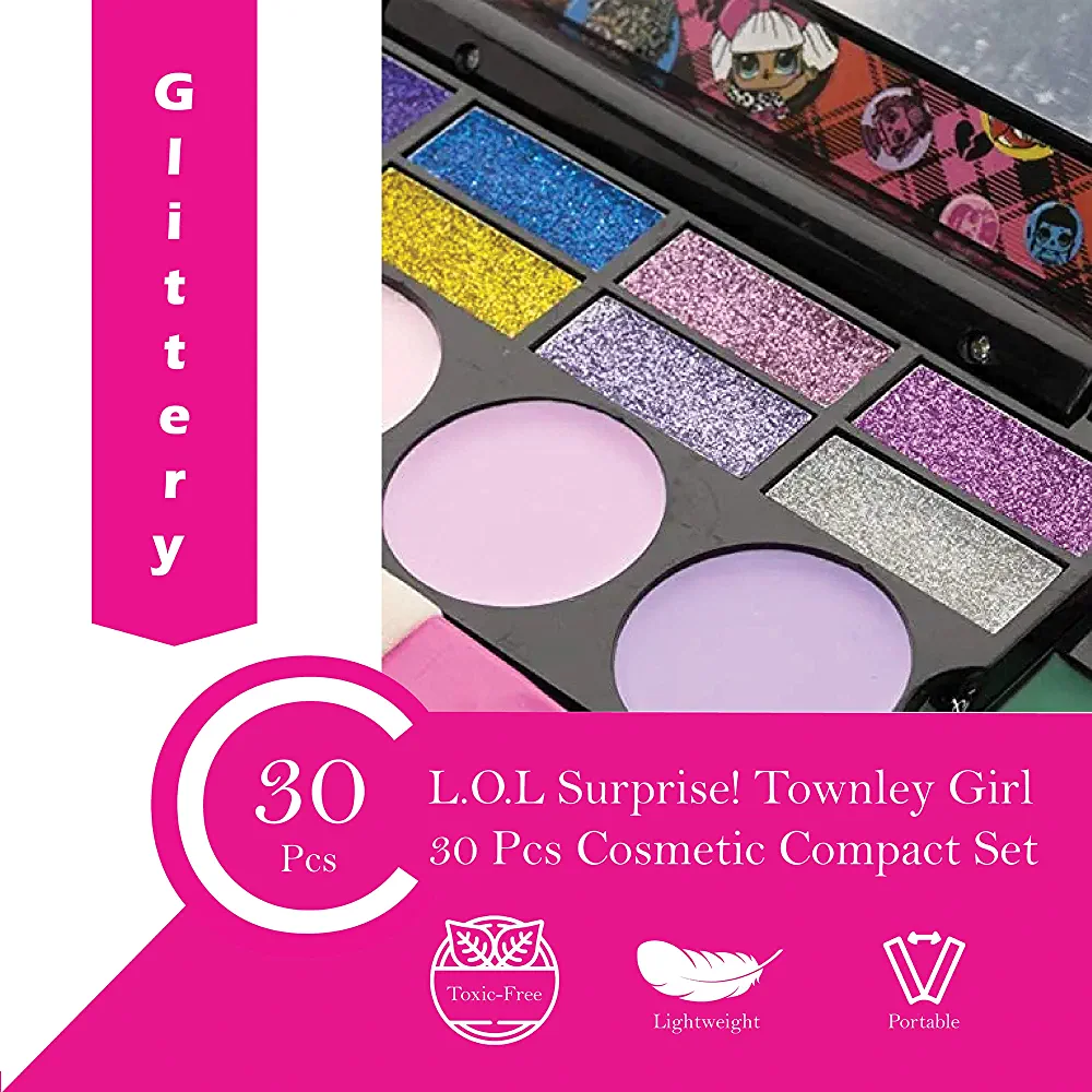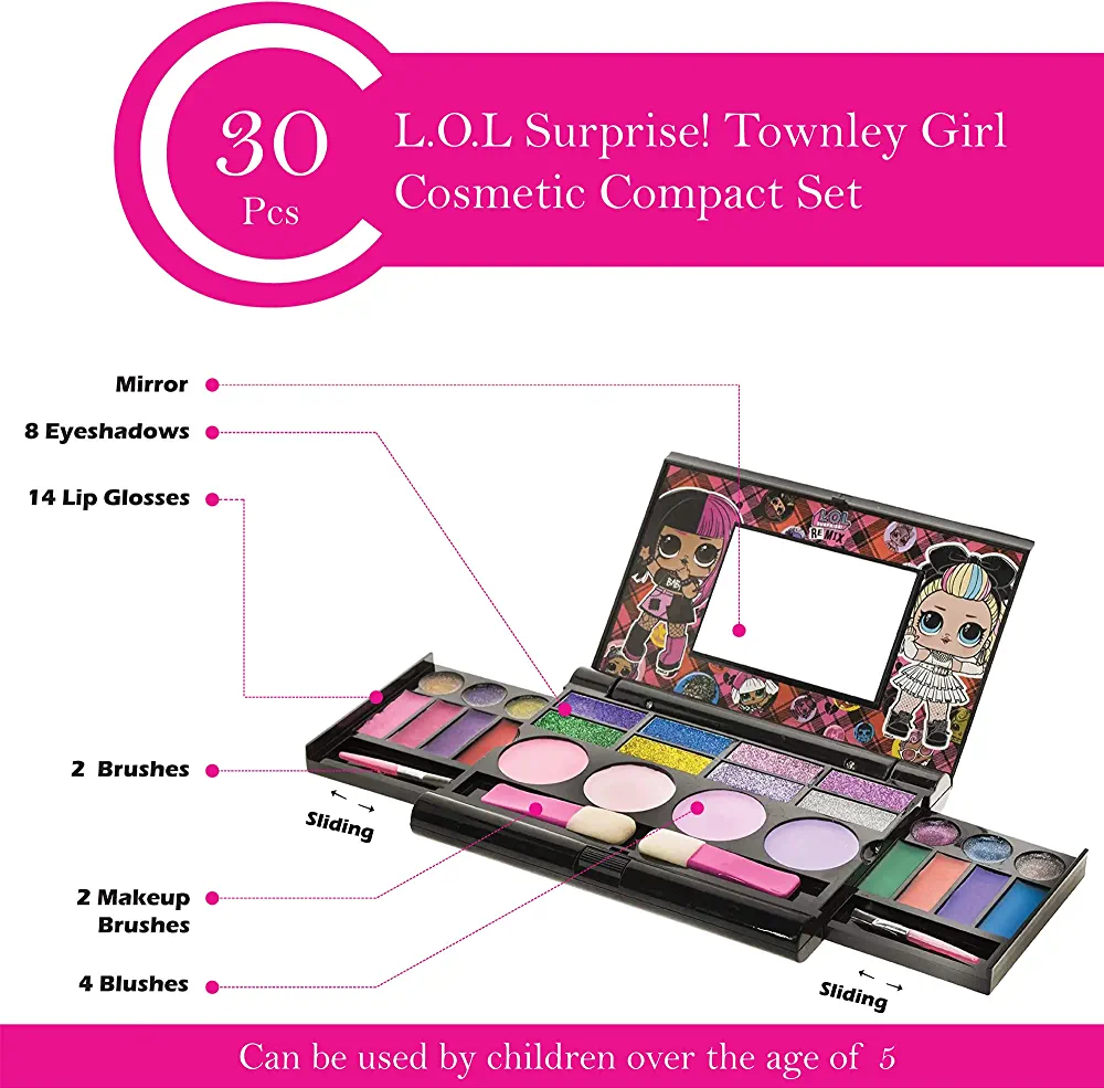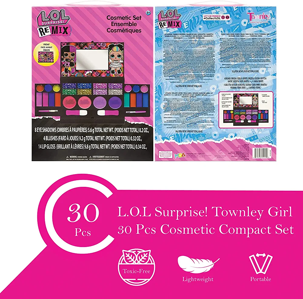 The L.O.L SURPRISE! TOWNLEY GIRL real teen make up set is the perfect addition to any little princess’s collection. With 14 lip glosses, 8 eye shadows, 4 eyebrow brushes, 4 eyelash brushes, and a foldable mirror, this set has everything needed for a complete makeup look.