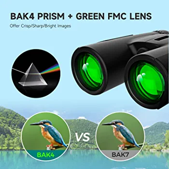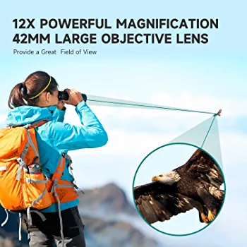 Experience clearer and brighter images with this BAK4 prism that boasts high reflectance and dielectric coating for superior brightness and 99.8% light transmission. With 12x magnification, these powerful binoculars allow you to observe nature in detail without shaking the image and still preserve enough field of vision. The fully multi-coated lens ensures better light transmission, making it vivid in low-light conditions. The nonslip rubber armor provides a comfortable touch and ensures shockproof and durability. It comes with a neck strap and packbag, making it easy to carry wherever you go. Please note that it is not suitable for complete darkness.