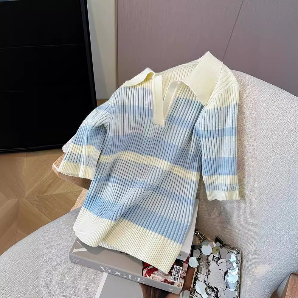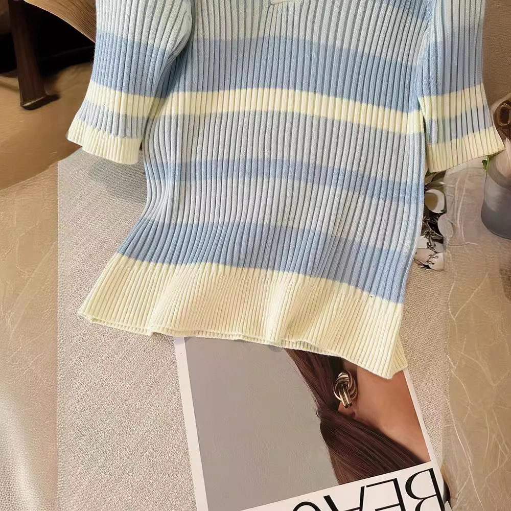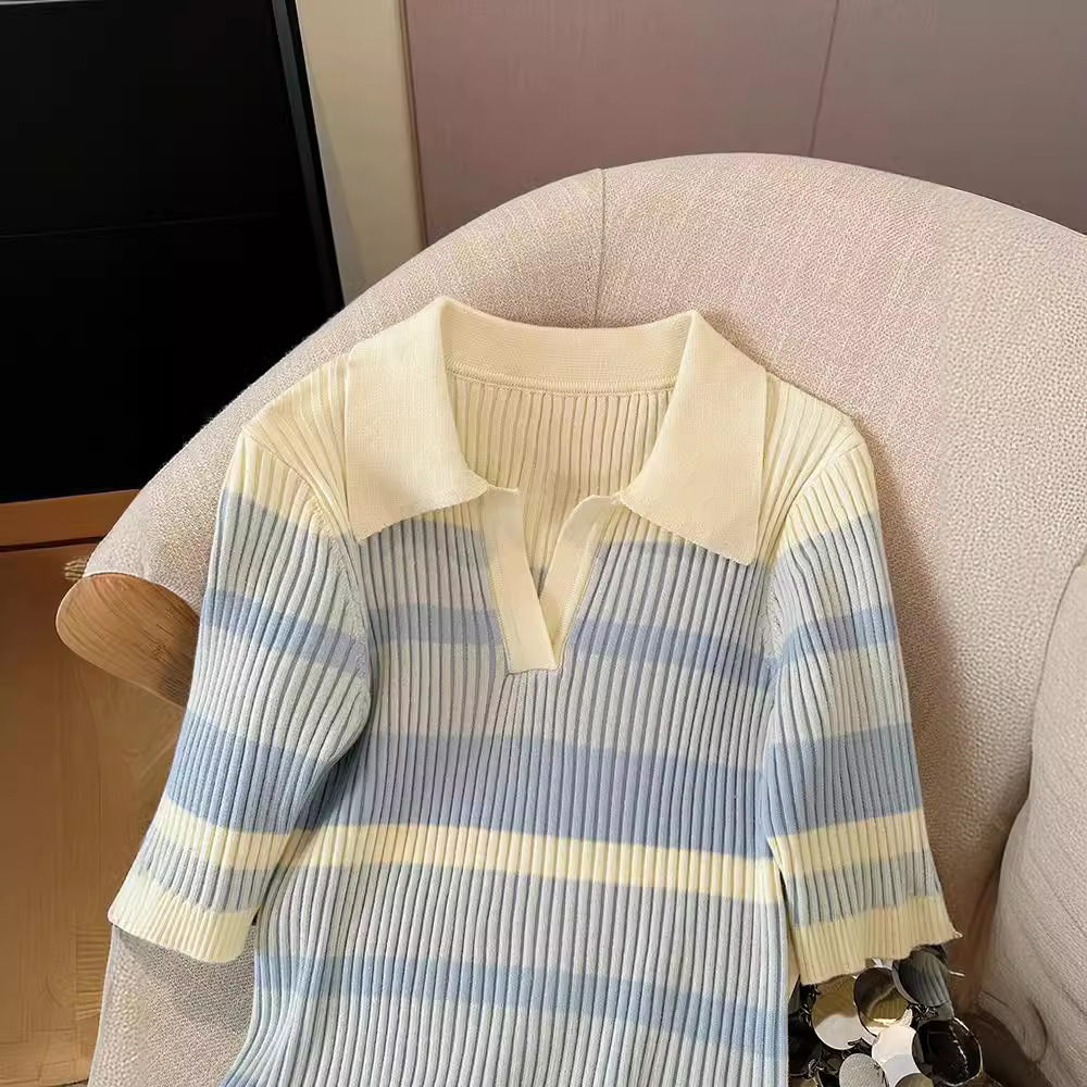 | nameOriginal | Contrast Blue and White Striped Sweater Women's Elegant POLO Collar Slim-fit Slimming V-neck Top Summer Short-sleeved Base Shirt |