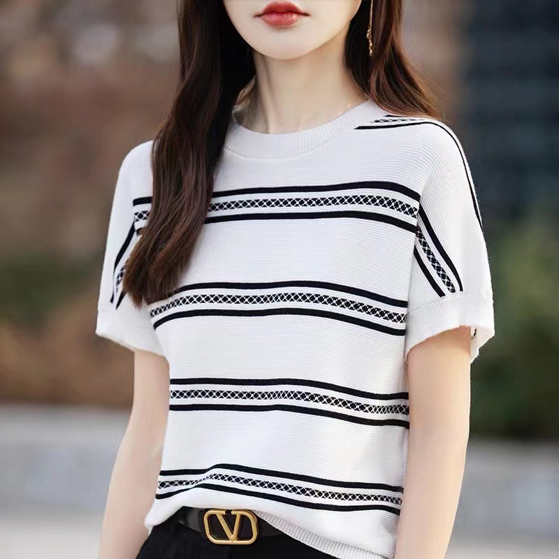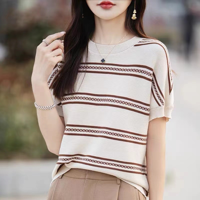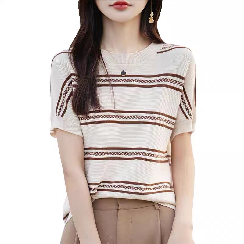 | nameOriginal | Contrast Color Age-reducing Ice Silk Short-sleeved T-shirt Women's 2024 Summer New Belly-covering Breathable Western-style Small Shirt Mother's Knitted Shirt |