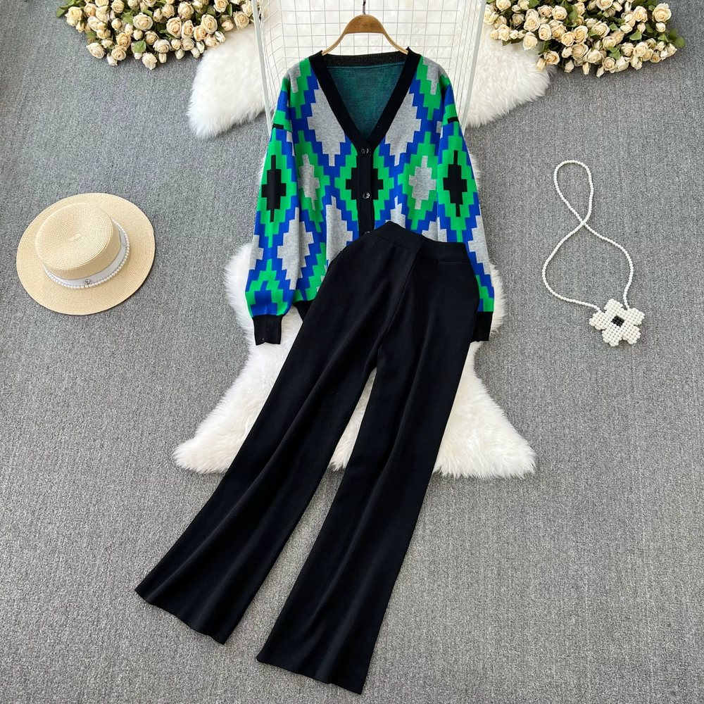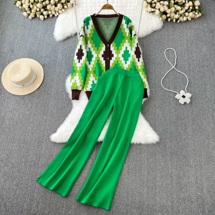 | nameOriginal | Contrast color knitted high-waisted floor-length fashion suit |