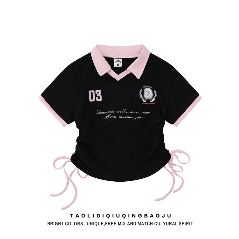 | nameOriginal | Contrast color POLO shirt short-sleeved casual right shoulder top with drawstring |
