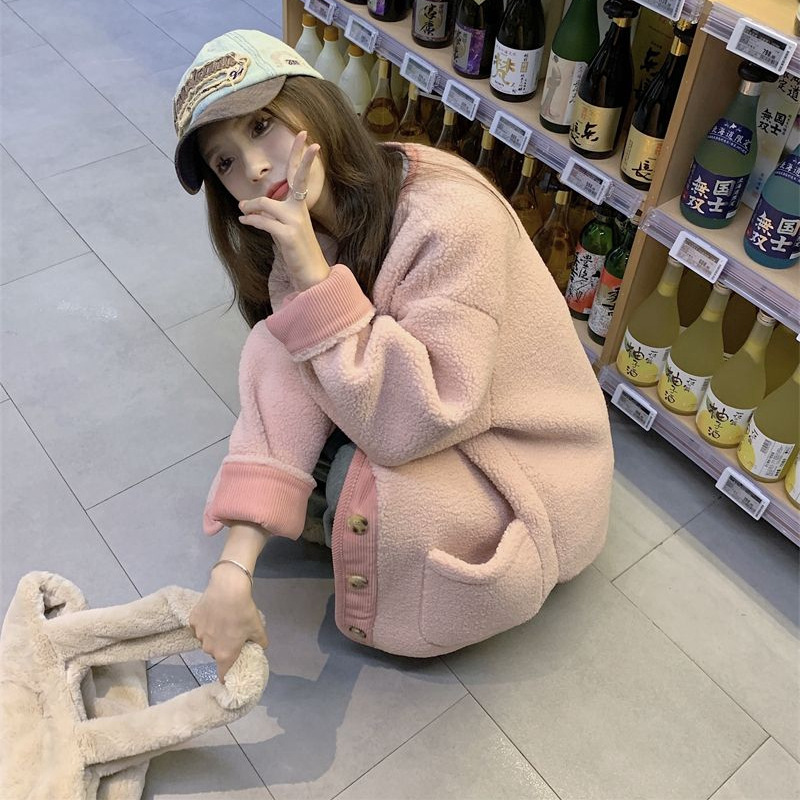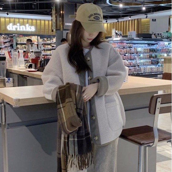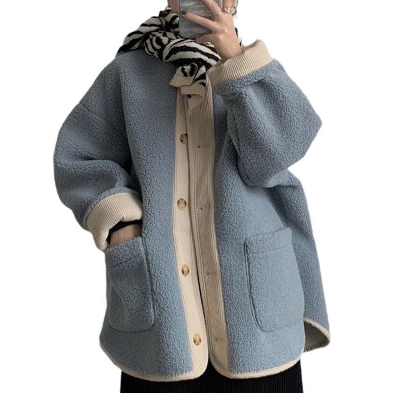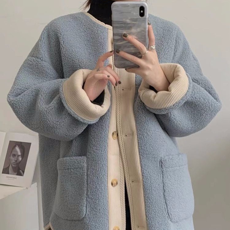 Contrast color retro lamb wool coat women's clothing new Chanel style student loose thick warm baseball jacket jacket