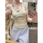 | nameOriginal | Contrast color short-sleeved summer slim and chic top with bow |