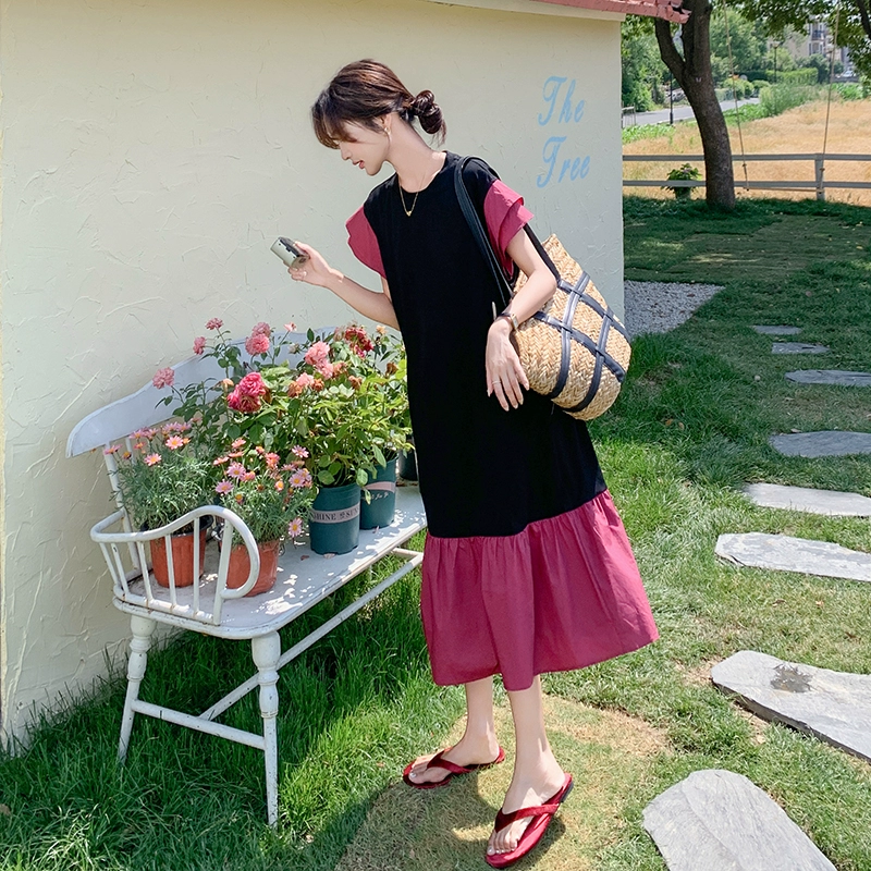 Contrast color slightly fat and elegant loose dress that covers the belly and looks slimming