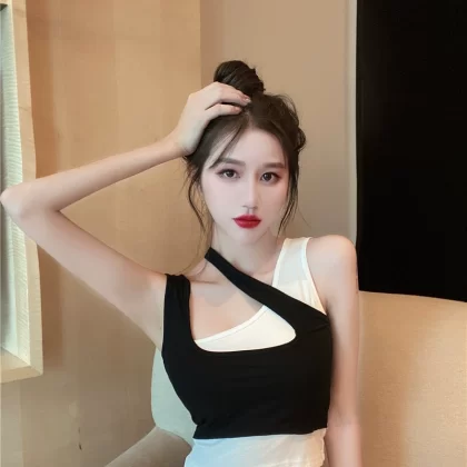 Two pieces of contrast -colored oblique shoulder design, two pieces of short upper clothes