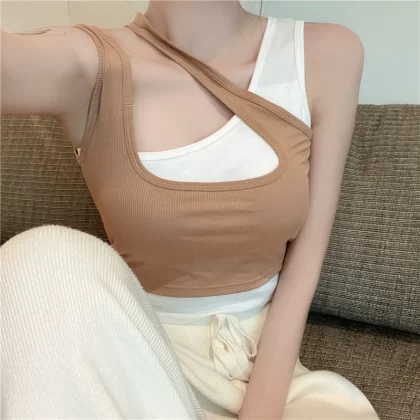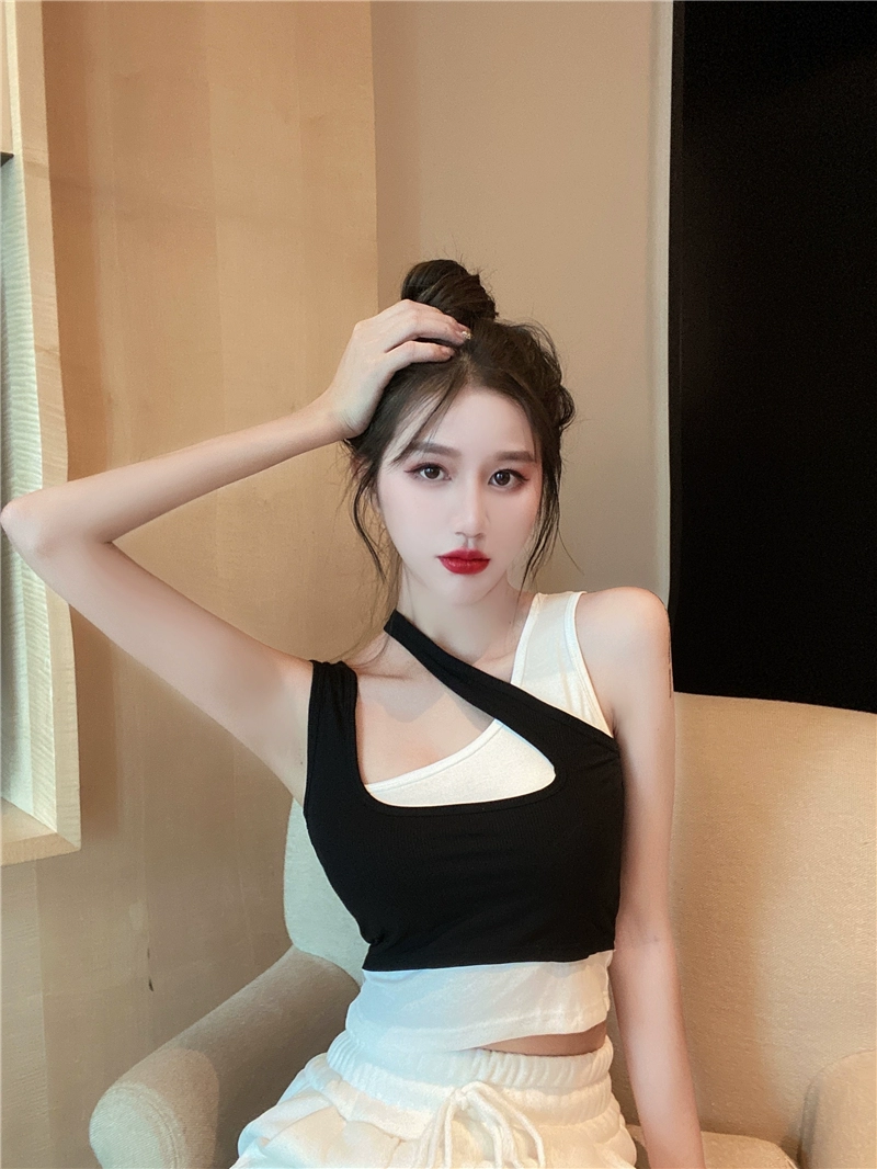 | nameOriginal | Contrast color sloping shoulder design sports short top fake two pieces |