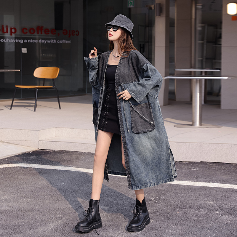 | nameOriginal | Contrast Color Stitching V-neck Mid-length Denim Jacket Retro Distressed Loose Long-sleeved Women's Windbreaker 2023 Spring New |