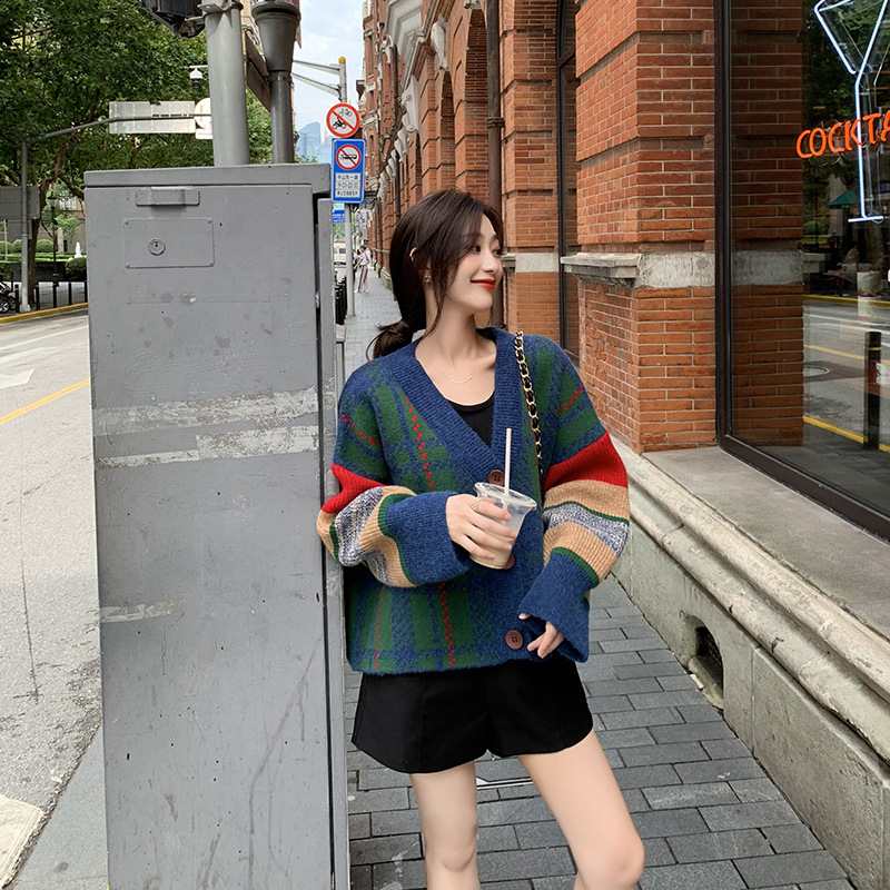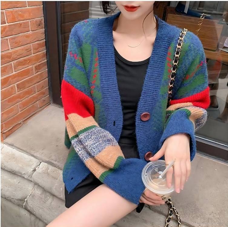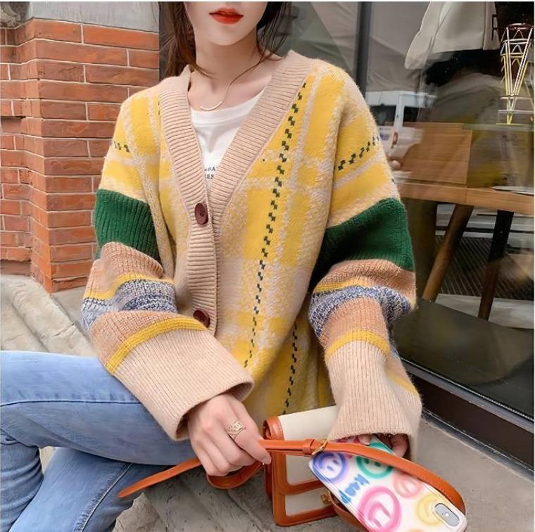 | nameOriginal | Contrast Color V-neck Knitted Cardigan Top Women's Autumn and Winter New Lazy Style Loose Outer Wear Soft Waxy Sweater Coat Women's Clothing |