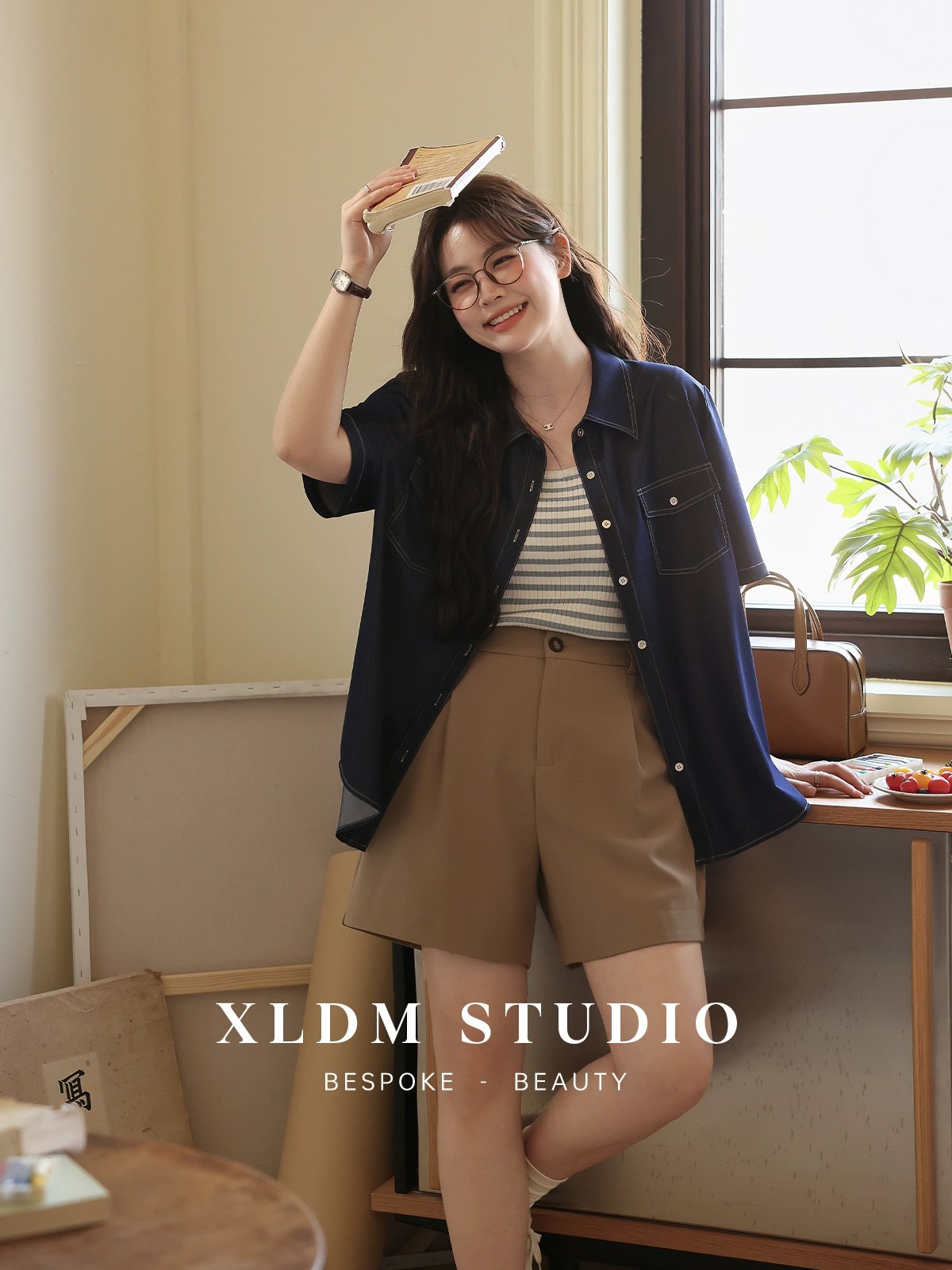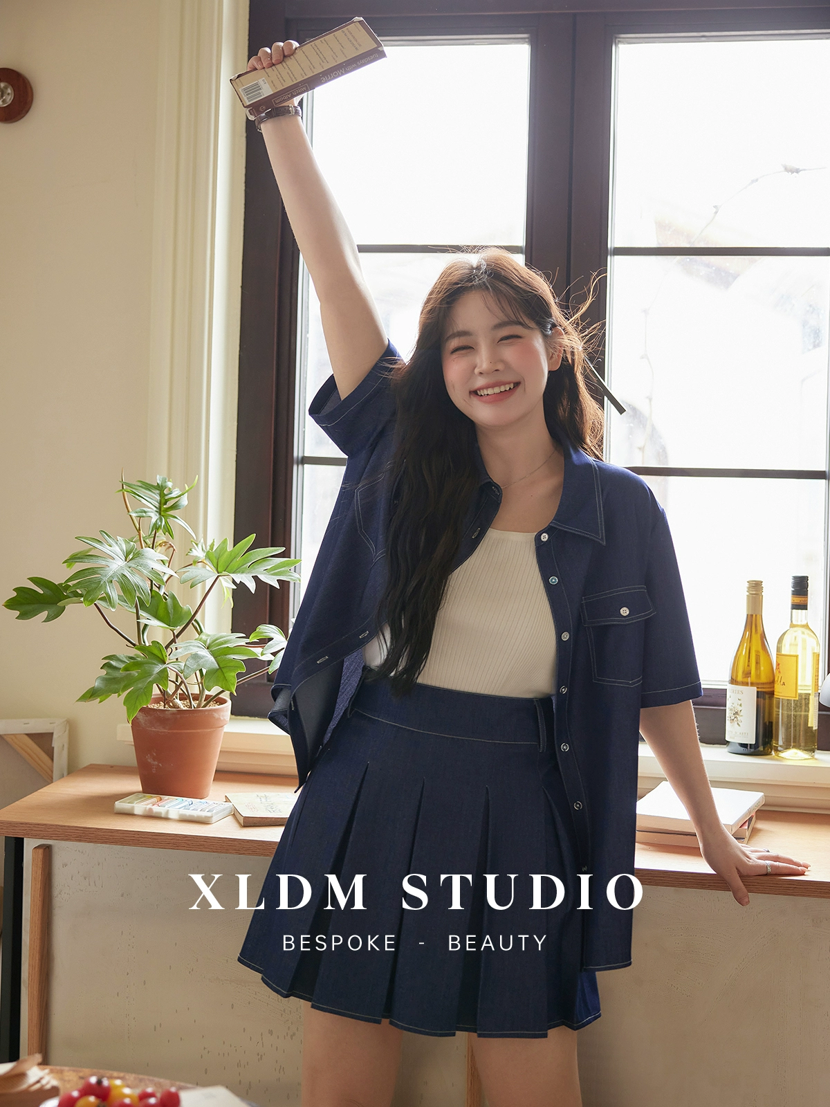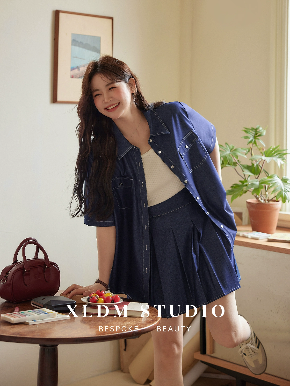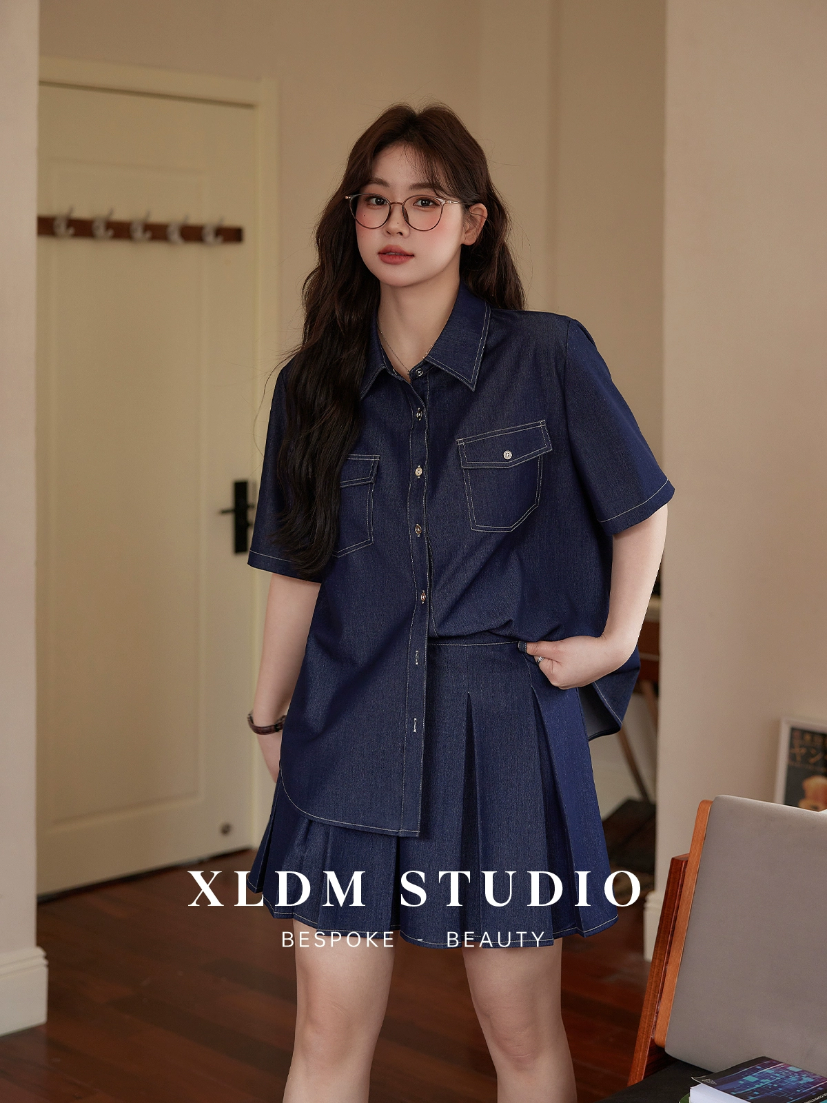 Contrast topstitched light shirt pleated skirt imitation denim