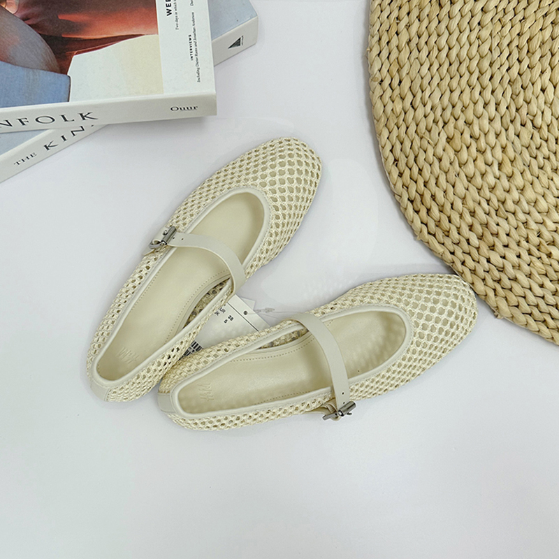 | nameOriginal | Cool summer HM fishnet round toe mesh one-word buckle ballet shoes for women hollow Mary Jane flat shoes |