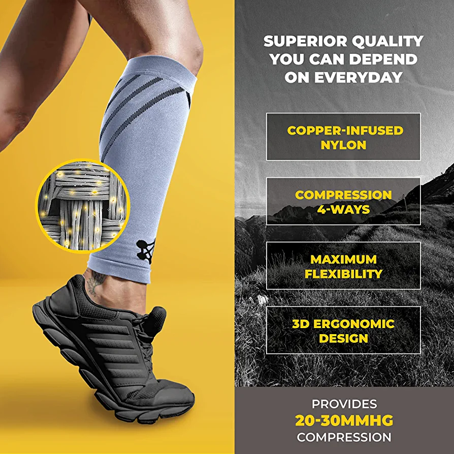 CopperJoint Calf Compression Sleeves provide 20-30mmHg support for men and women. Ideal for leg cramp relief, varicose veins, and running. Made with copper-infused nylon in grey, size X-Large.