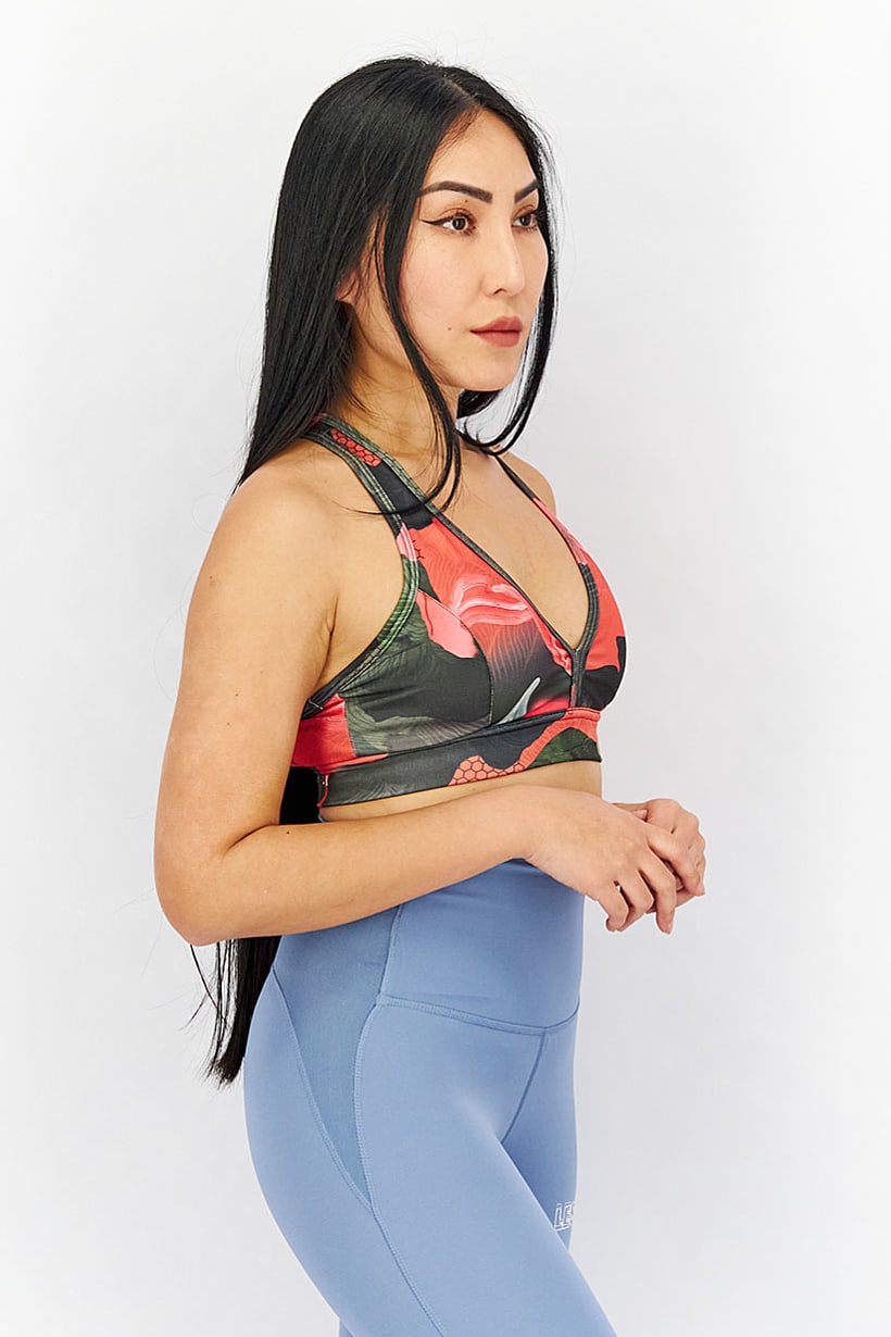 This sports bra is designed for training and has a sportswear fit. It is made of a light fabric blend of 90% polyester and 10% elastane, with a floral print in green. The care instructions recommend hand washing. Please note that the product color may appear slightly different due to lighting or monitor settings. The size shown is in US measurements.